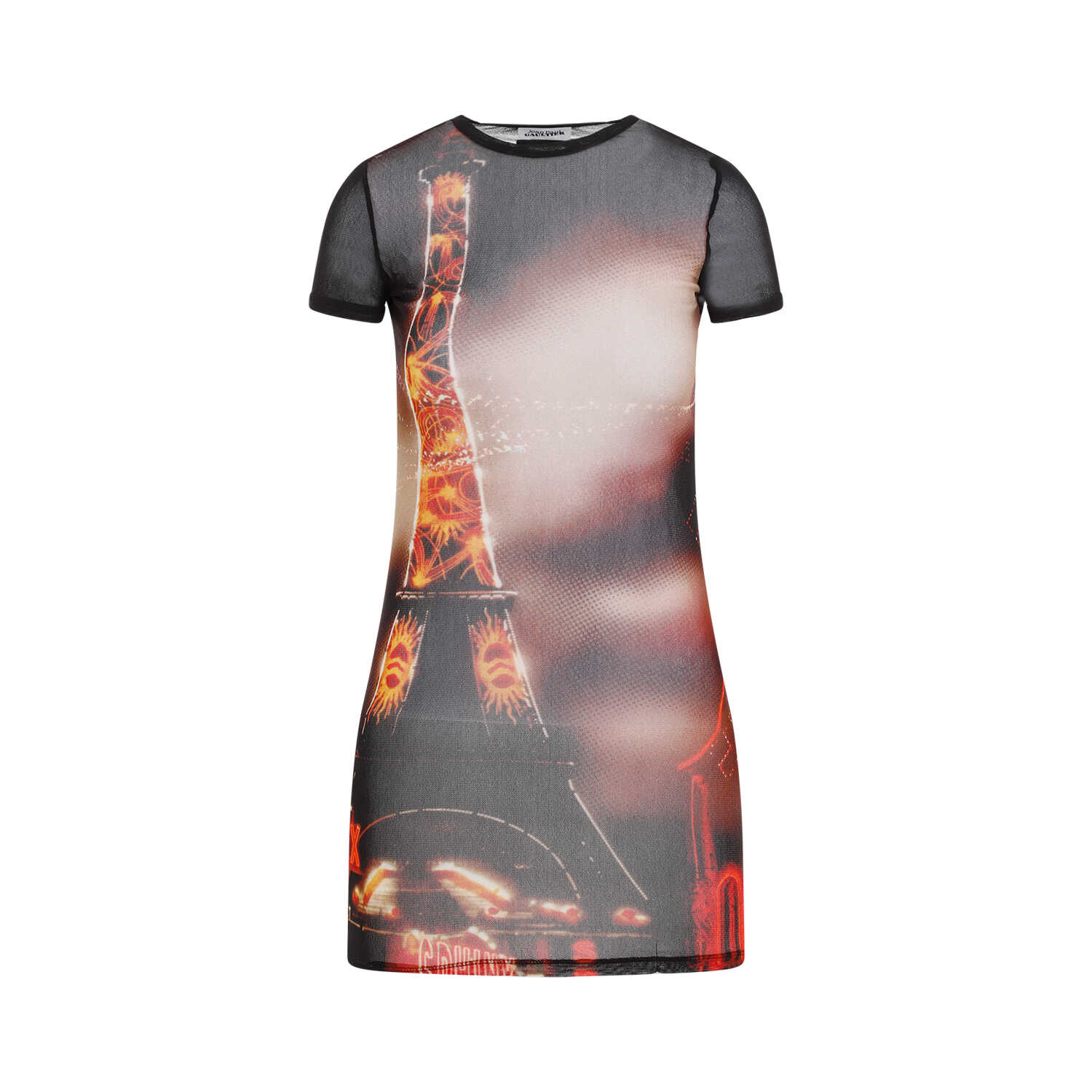 Stand out in style with this stunning black mesh mini dress from JEAN PAUL GAULTIER. Featuring a unique Pigalle print on the front and back, this dress is perfect for a night out. Crafted from a polyamide blend, it offers a comfortable fit with a round neck, short sleeves, and a mini-length design. Elevate your wardrobe with this chic and fashionable piece.