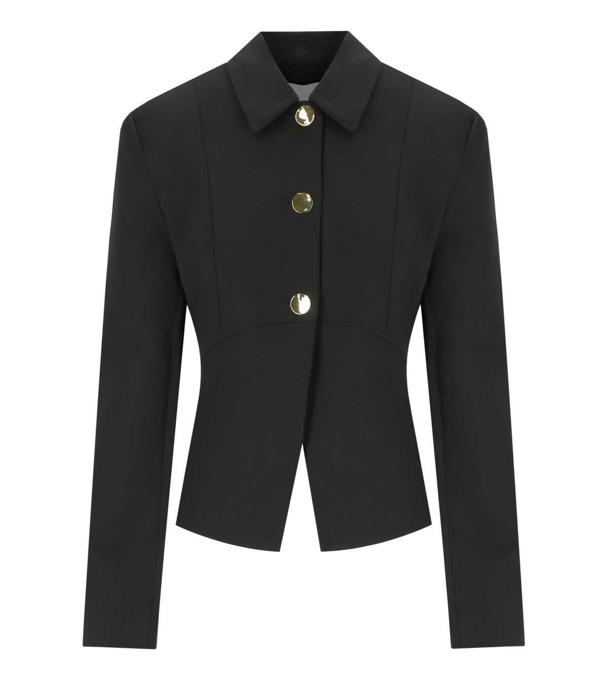 Ganni jacket made of twill in black. Characterized by a classic pointed collar, it features a front closure with three gold buttons. Equipped with long sleeves and padded shoulders, it is finished with a slight pleat at the waist. Slim fit.