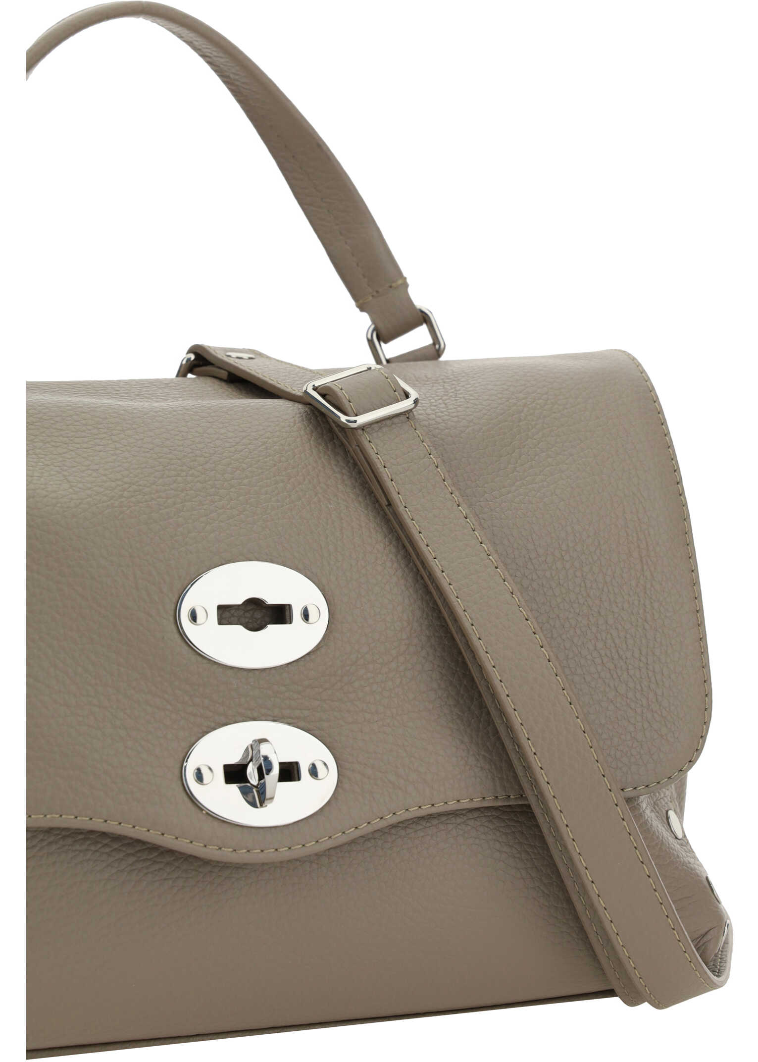 Calfskin Daily Postina Shoulder Bag by Zanellato, single flat leather top handle, front hook-and-loop closure, adjustable and removable shoulder strap, flat studs on side panels, two interior compartments with welt pocket.
