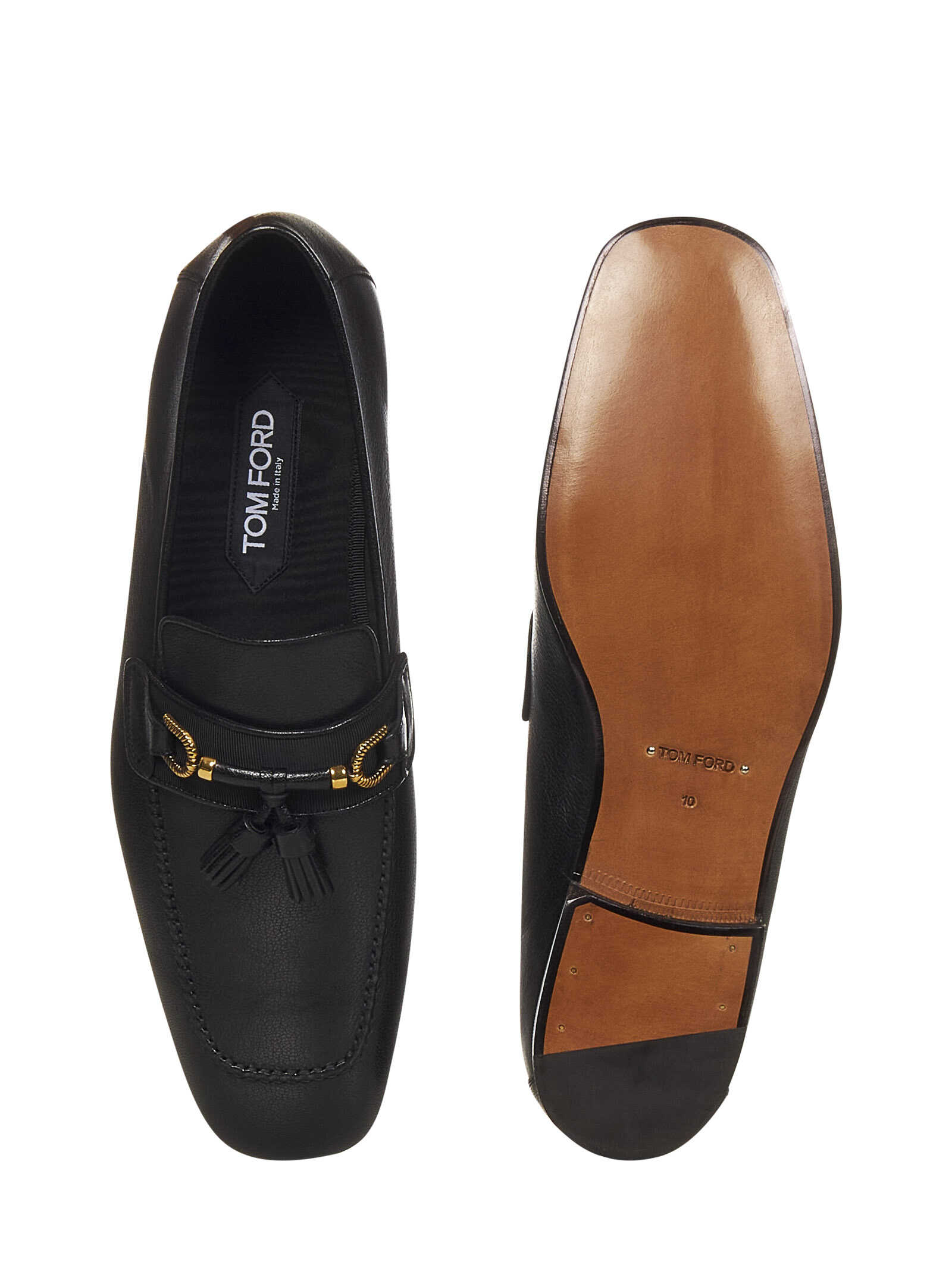 Jack loafers in black leather with grosgrain band and tassels on the front.