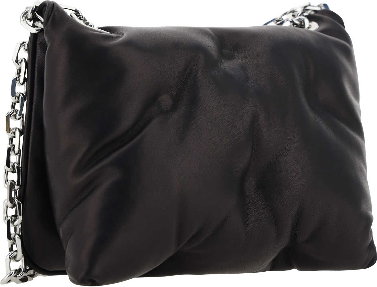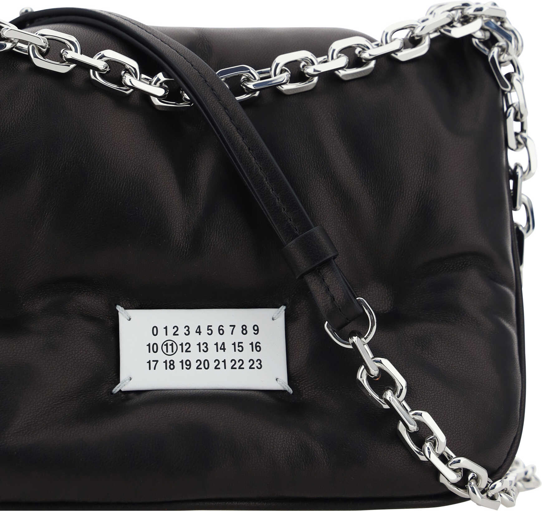 Calfskin Glam Slam Flap Shoulder Bag by Margiela, padded and quilted design, chain shoulder strap with sliding leather details, magnetic front closure, iconic fabric patch with contrasting embroidered brand signature on front, interior welt pocket.