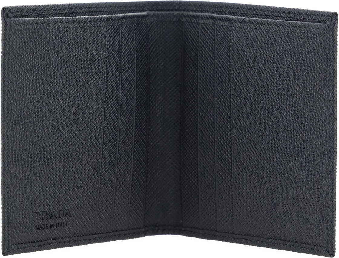 Saffiano Leather Wallet by Prada, billfold design, triangular logo plaque on front, interior card slot, bill compartment.