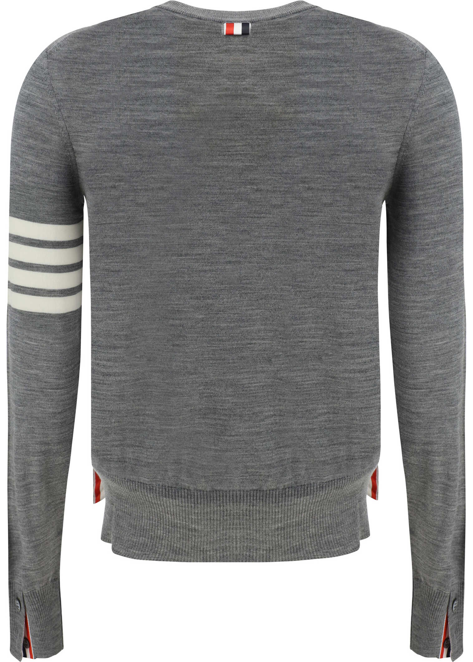 Fleece Wool Sweater by Thom Browne, ribbed crew neck, ribbed hem with side buttons to adjust slits, ribbed cuffs with buttons, slim fit, iconic brand horizontal stripes on left arm.