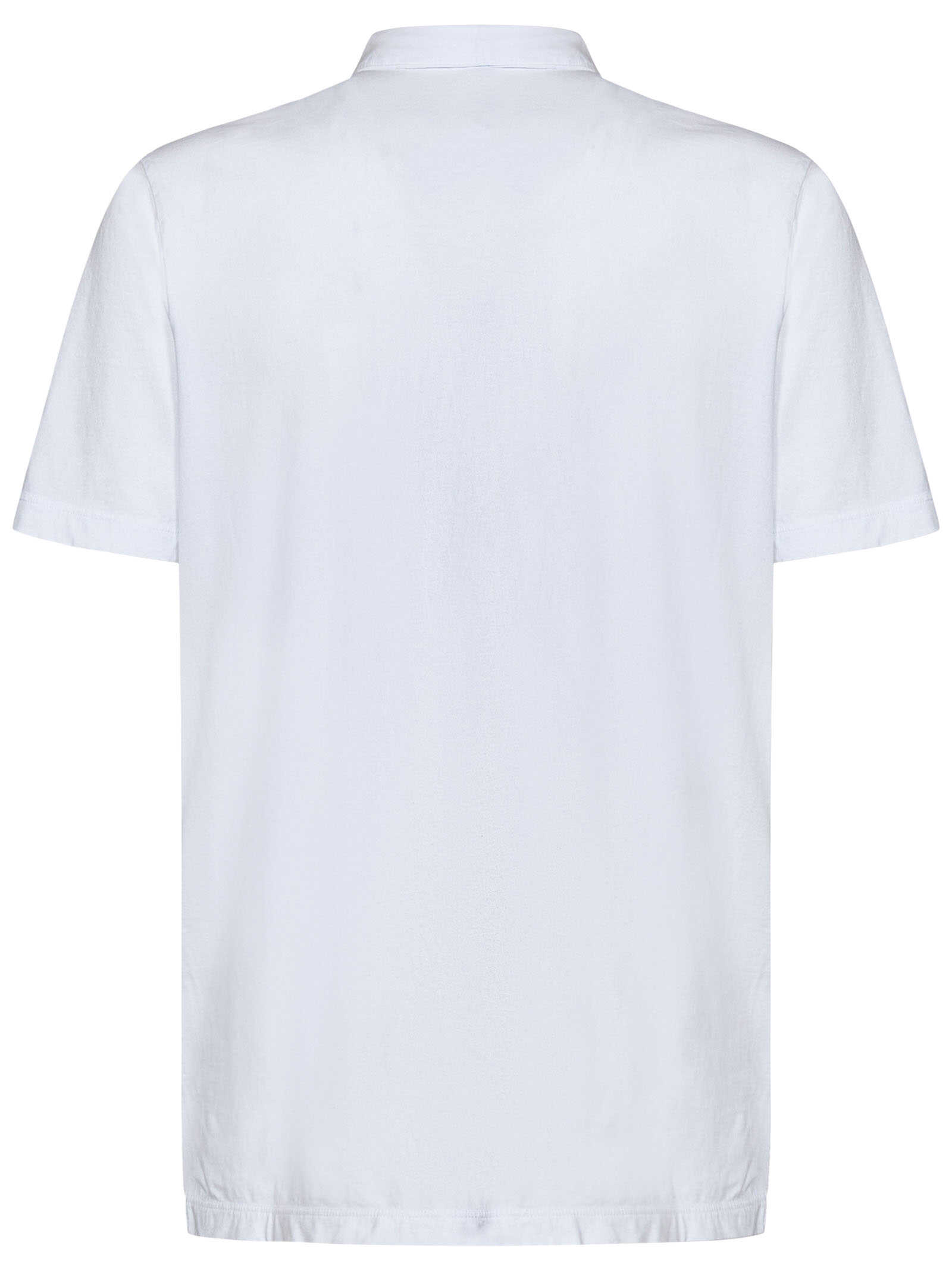 Garment-dyed white suede jersey polo shirt with pointed collar.