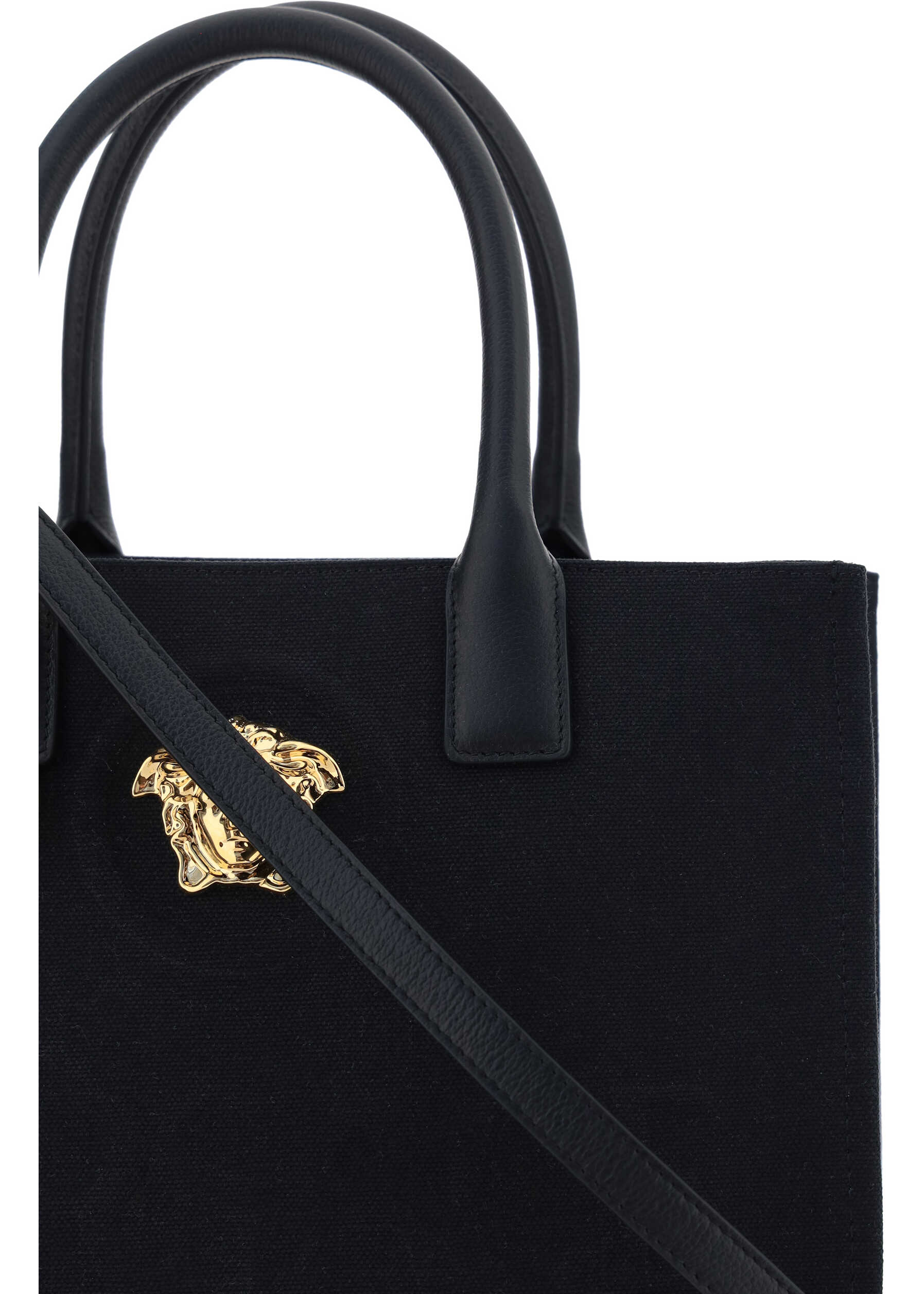 Cotton Shoulder Bag by Versace, rigid leather top handles, removable flat shoulder strap, top button closure, single interior compartment, iconic brand monogram embossed on front, leather feet at base, iconic Medusa embossed applique on front.