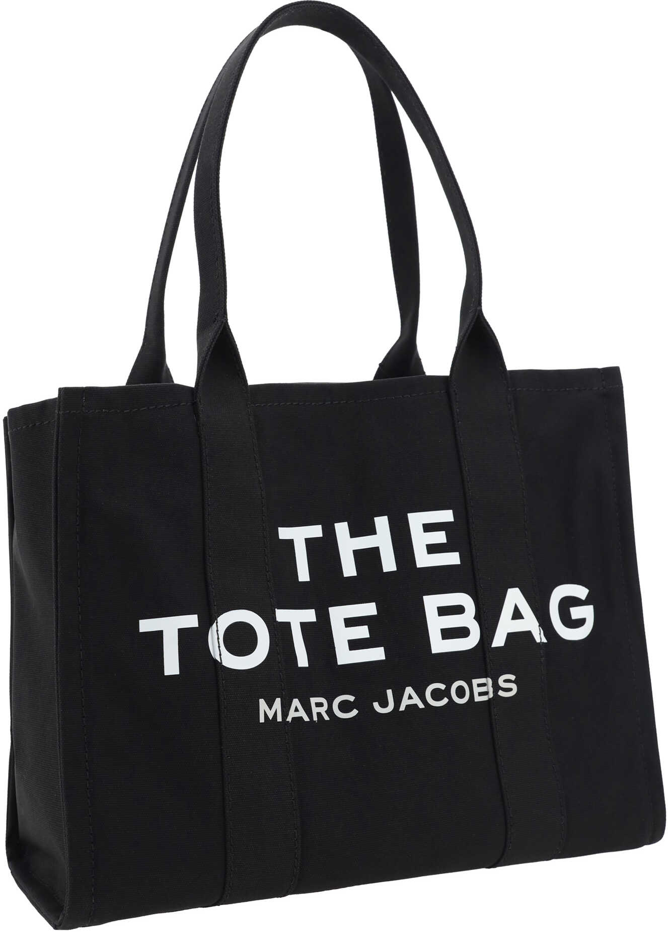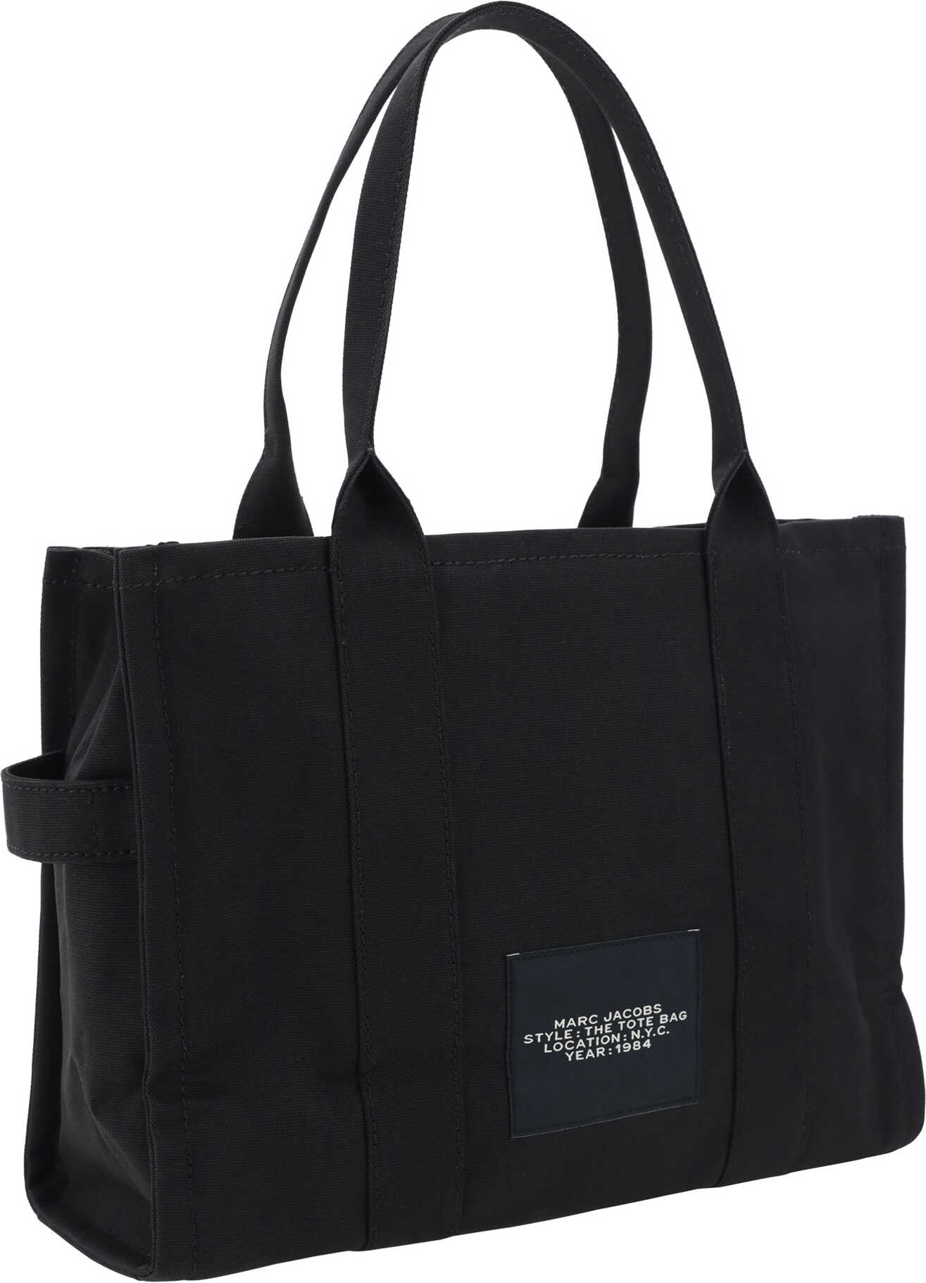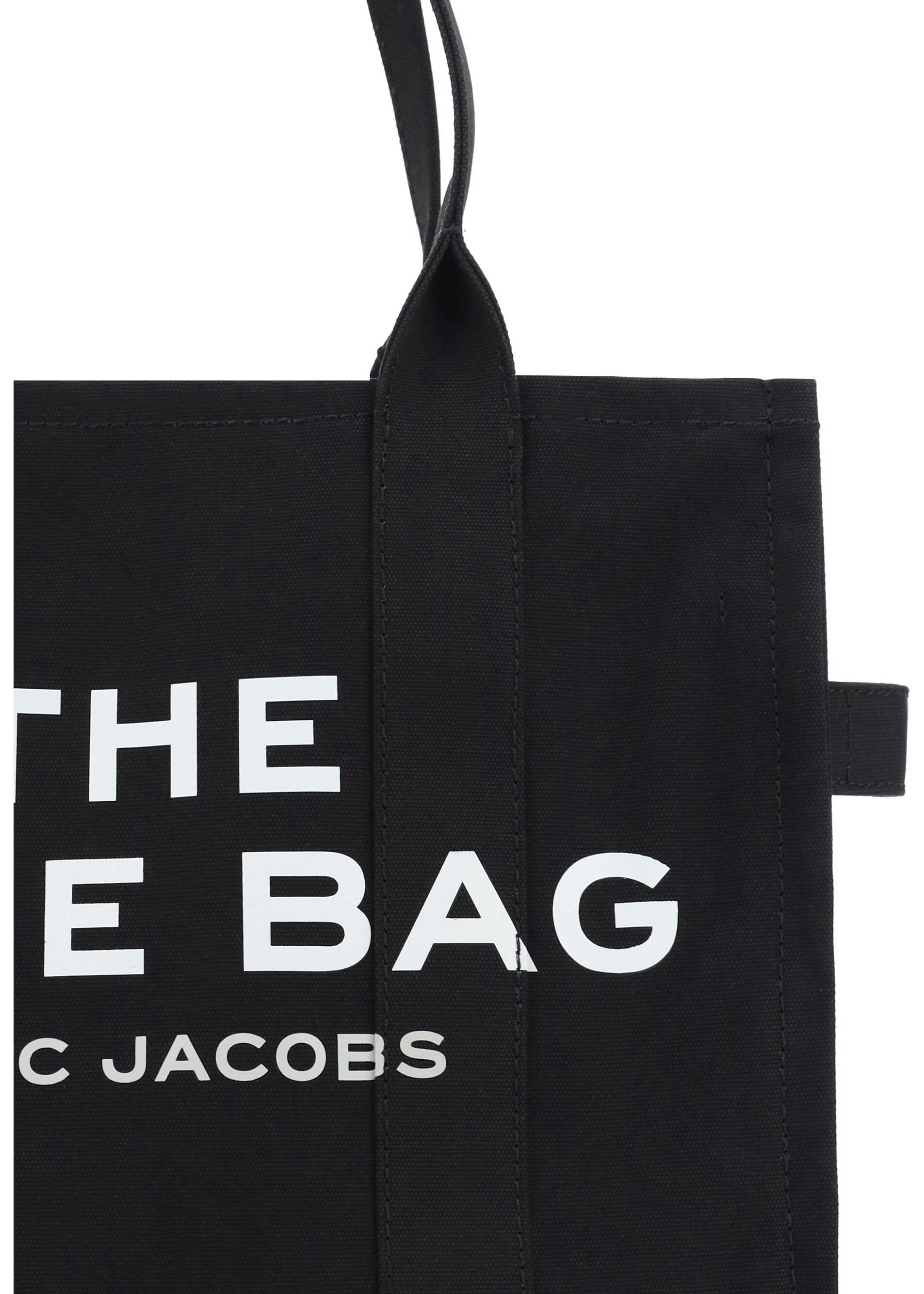 The cotton The Large Tote Handbag by Marc Jacobs, two rigid tubular top handles, top zipper closure, single interior pocket, adjustable and removable flat shoulder strap, contrasting jacquard print iconic brand monogram on front, contrasting patch with iconic brand monogram applied on back.