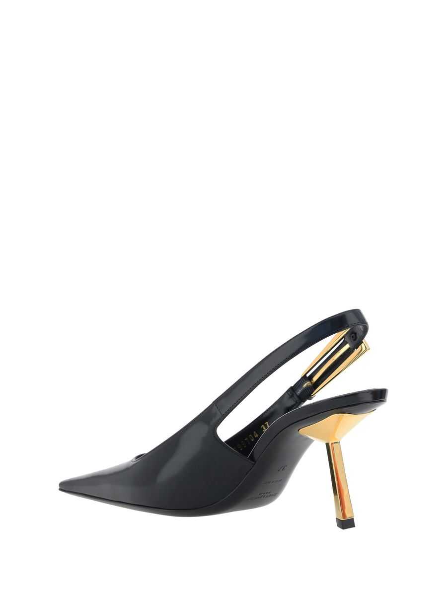 'Lee' shiny leather slingbacks, adjustable strap with metal buckle, gold-plated geometric heel
