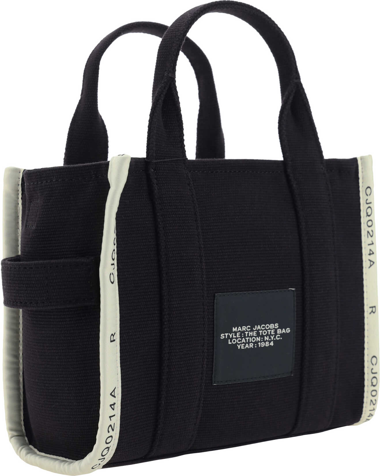 Cotton The Jacquard Small Tote Handbag by Marc Jacobs, two rigid tubular top handles, top zipper closure, single interior pocket, adjustable and removable flat shoulder strap, contrasting jacquard print iconic brand monogram on front, contrasting patch with iconic brand monogram applied on back.