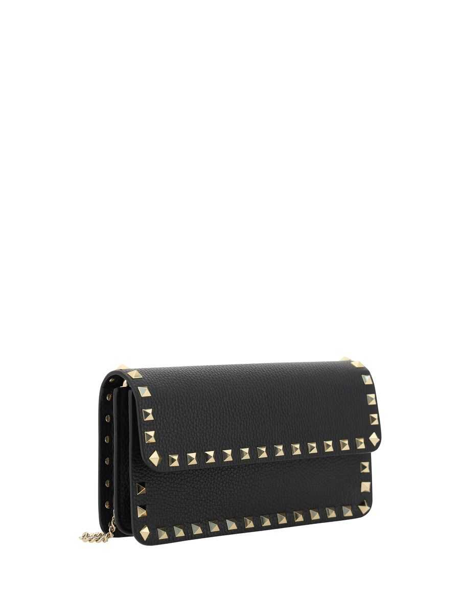 Valentino Garavani's wallet on chain crafted in black grained leather adorned by signature platinum-tone metal studs. Featuring magnetic button closure on flap and removable chain strap. Black leather / fabric-lined interior with two bill compartments separated by slip pocket, zip pocket and eight card slots. The design is completed by the embossed logo at back.