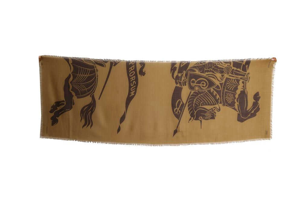 Burberry's scarf crafted in khaki green wool with screen-printed Equestrian Knight Design and logo. It features eyelash fringing at edges.