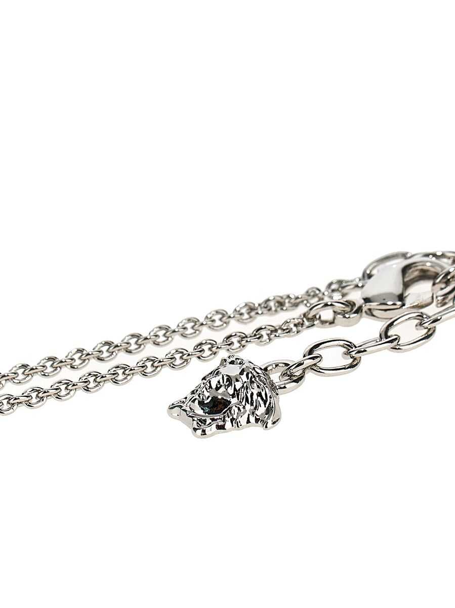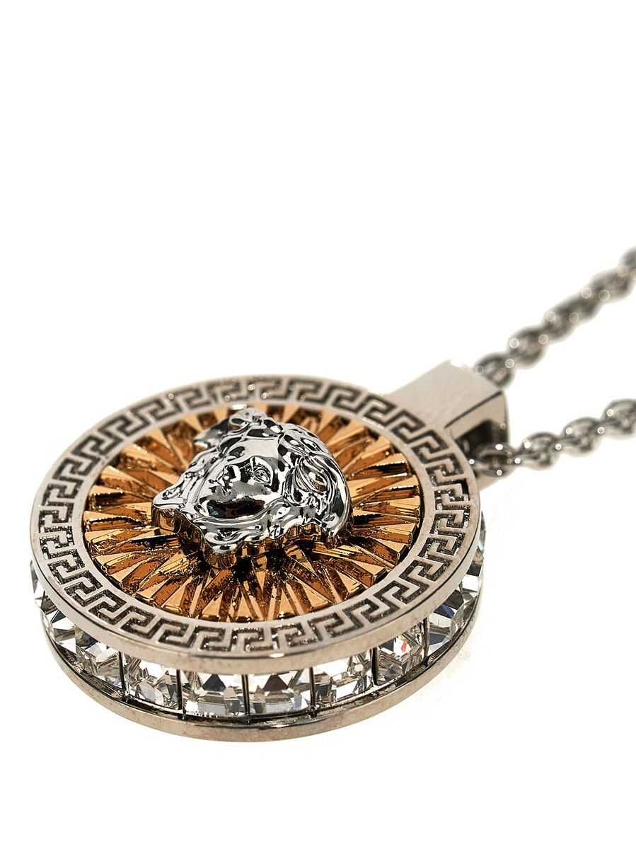 Silver tone metal necklace from Versace featuring silver tone and gold and Medusa detail.