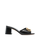 Black color, calfskin, branded leather insole, applique logo, peep toe, single toe strap, slip-on style and medium block heel.