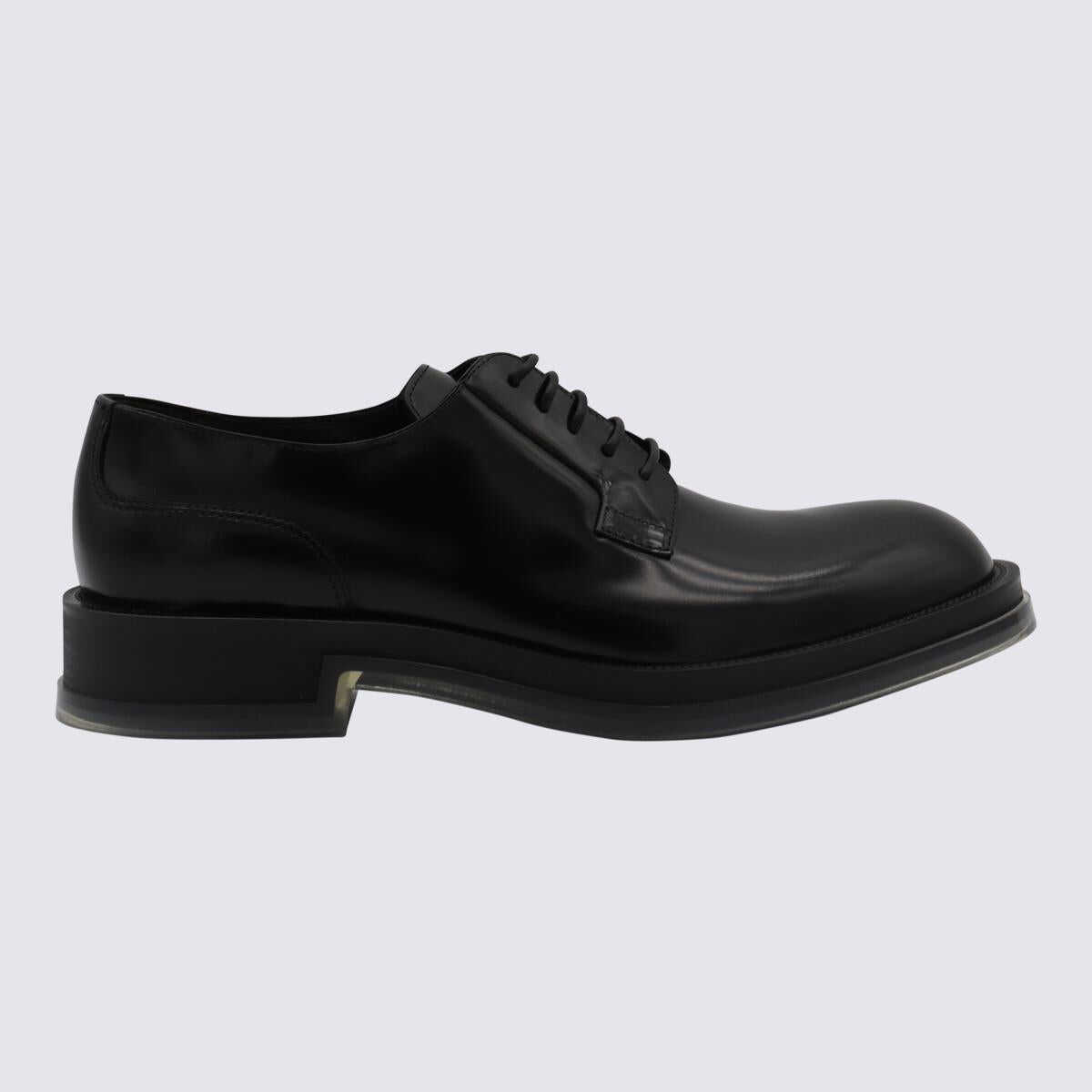 Black leather lace up shoes from Alexander McQueen featuring round toe, lace fastening, leather sole and details.