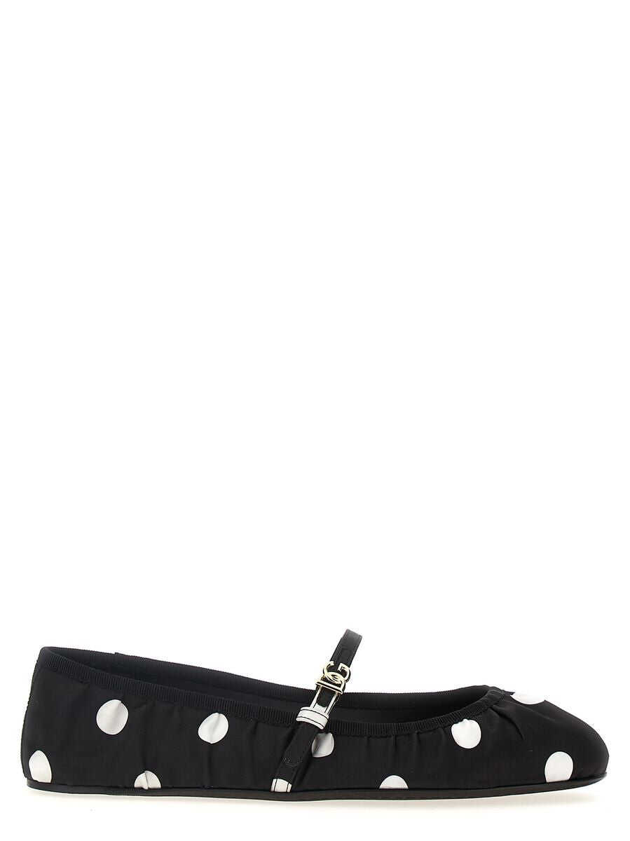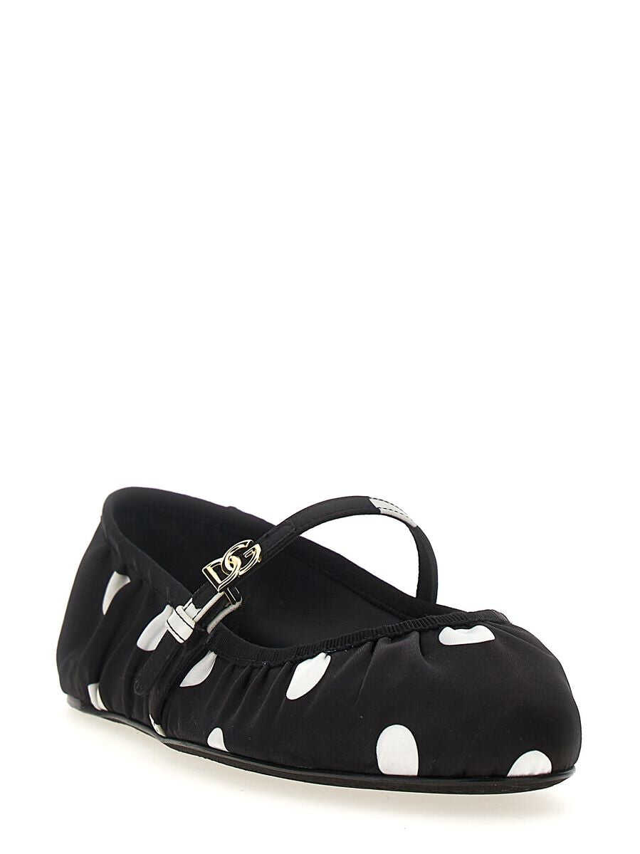 Black, leather, polka dot print, buckle-strap fastening, flat sole.
