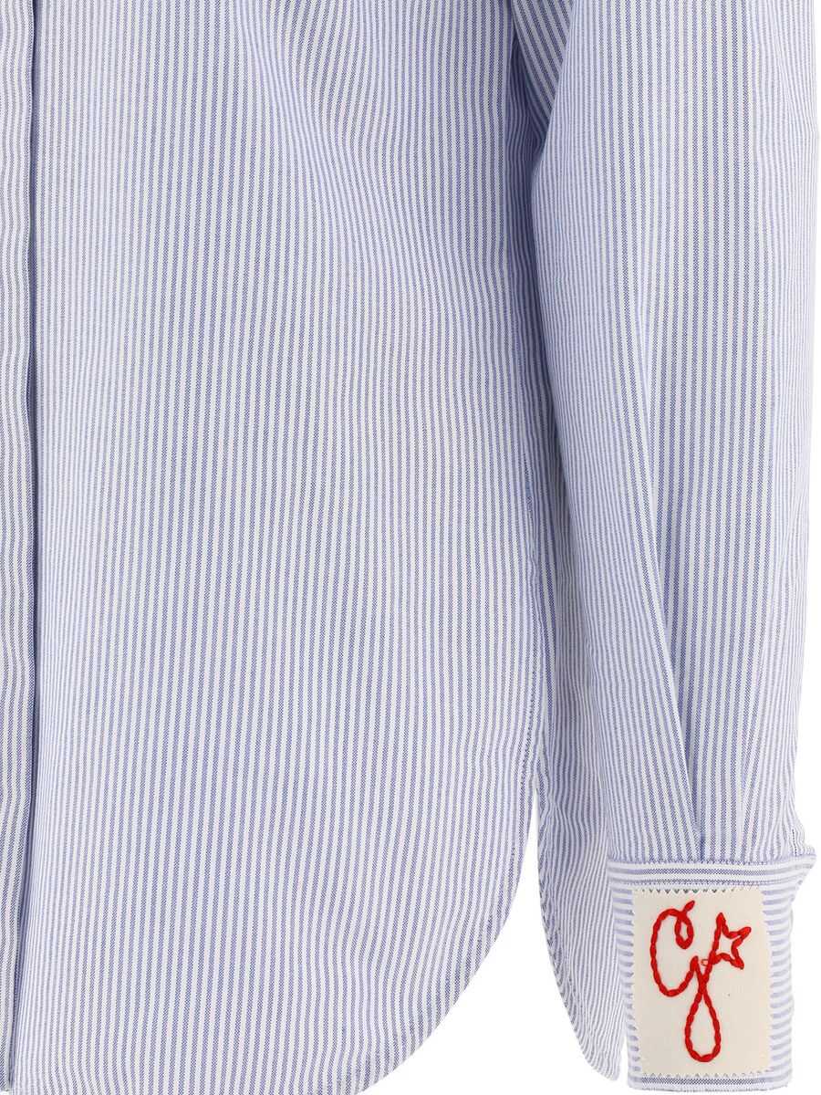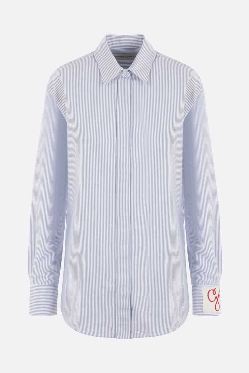 Shirt Golden Goose "G" made of White cotton. Light Blue striped pattern. Classic collar. Hidden button closure. Buttoned cuffs. Removable White stamp with the Red letter "G" embroidered on the wrist. Metal "Star" logo under the neckline on the back. Regular fit.
