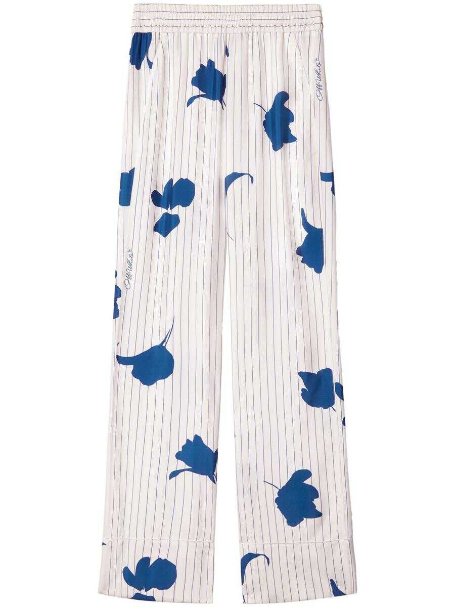 white/cobalt blue poplin texture floral print pinstripe print mid-rise elasticated waistband straight leg slip pockets to the sides