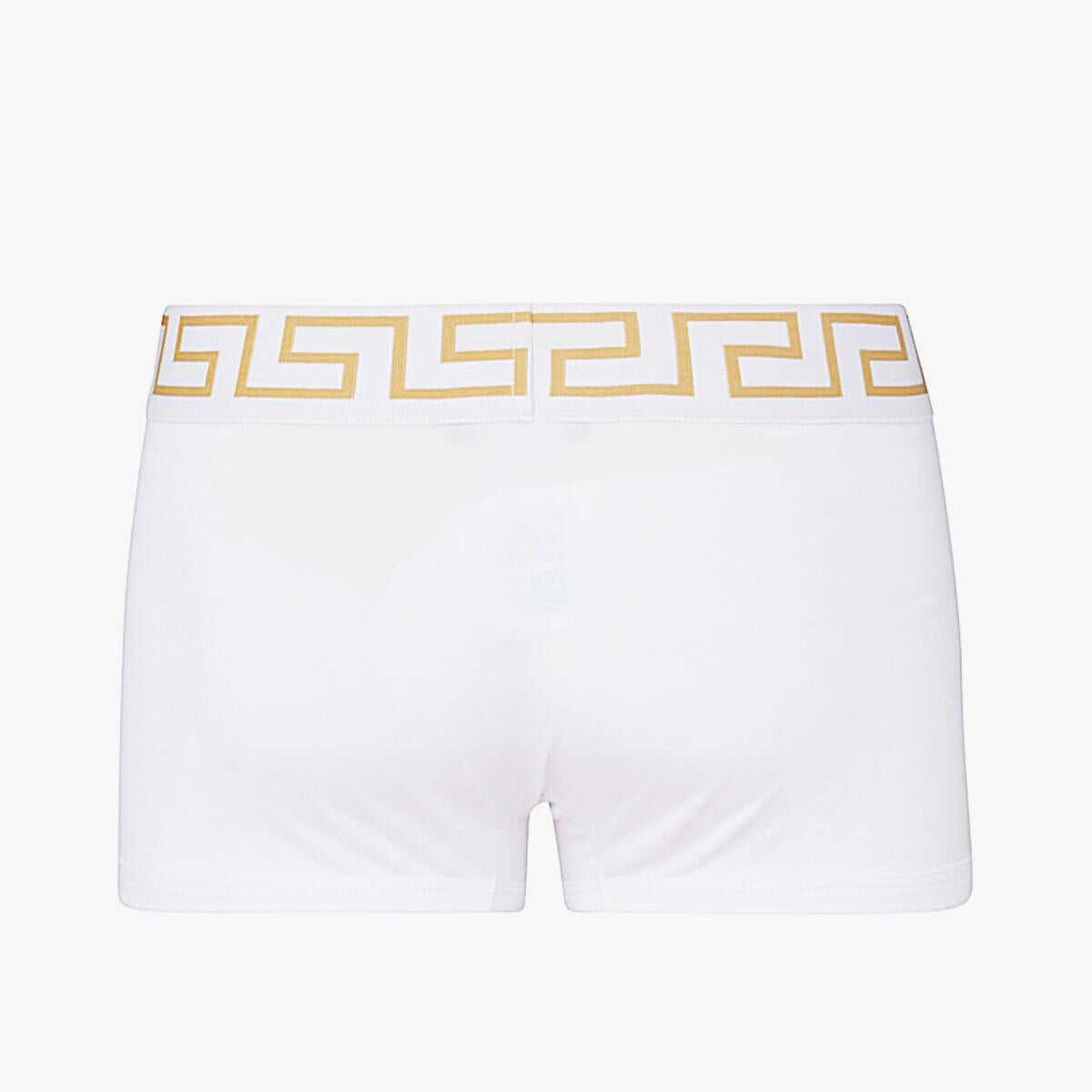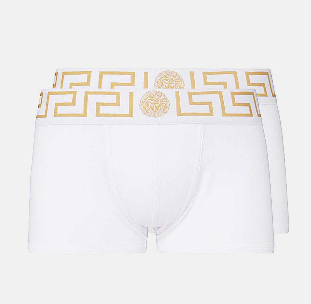 White cotton Greca boxers two pieces set from Versace featuring elasticated waistband with Greca and Medusa detail and regular fit. This is a pack of two items.