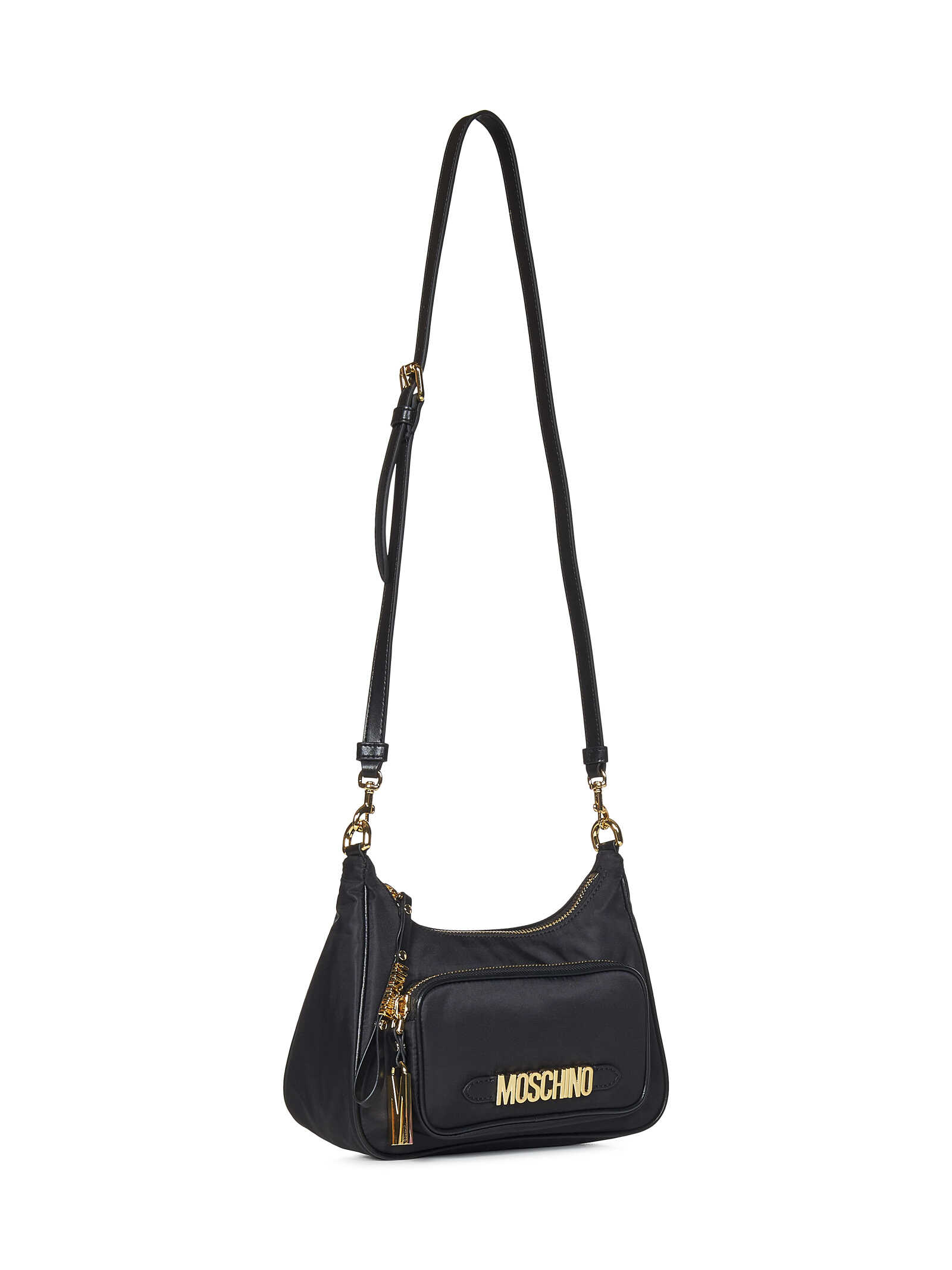 Elevate your style with this chic and versatile black Moschino shoulder bag. Crafted from a blend of cotton, polyamide, and polyurethane, this bag features a metal lettering logo on the front and comes with a handle and shoulder strap for added convenience. With dimensions of 20cm in height, 25cm in length, and 9cm in depth, this bag is the perfect accessory for any occasion.