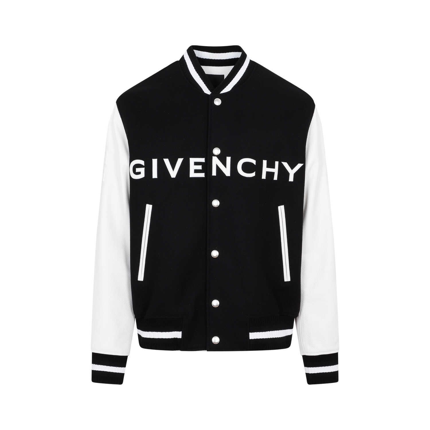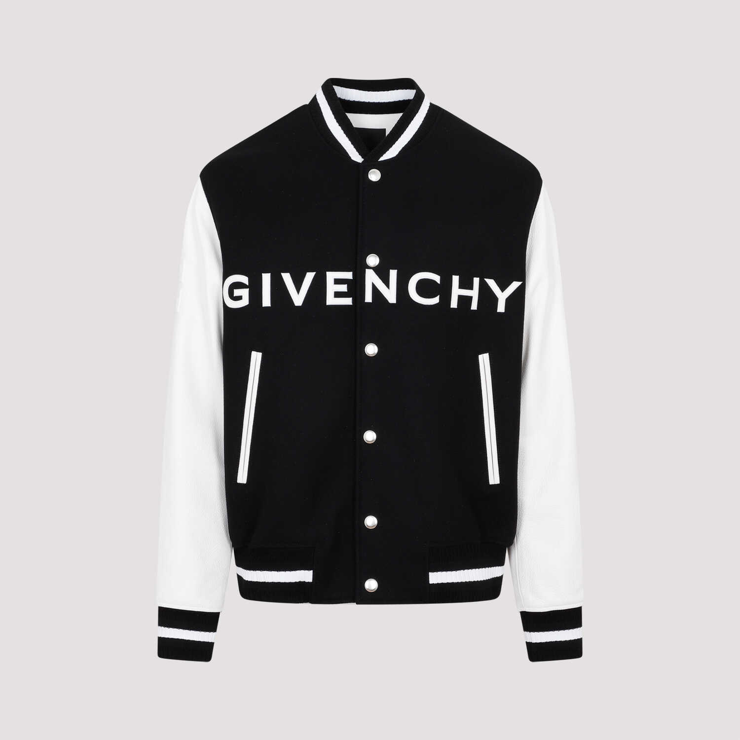 Make a statement with this stylish Givenchy varsity jacket. It features a sleek black design with white leather sleeves, ribbed collar, cuffs, and hem for a classic varsity look. The front snap button fastening and side slit pockets add functionality, while the iconic white Givenchy logo on the front adds a touch of luxury. Crafted from a high-quality wool and leather blend, this jacket is perfect for adding a touch of sophistication to any outfit. Upgrade your wardrobe with this must-have piece.