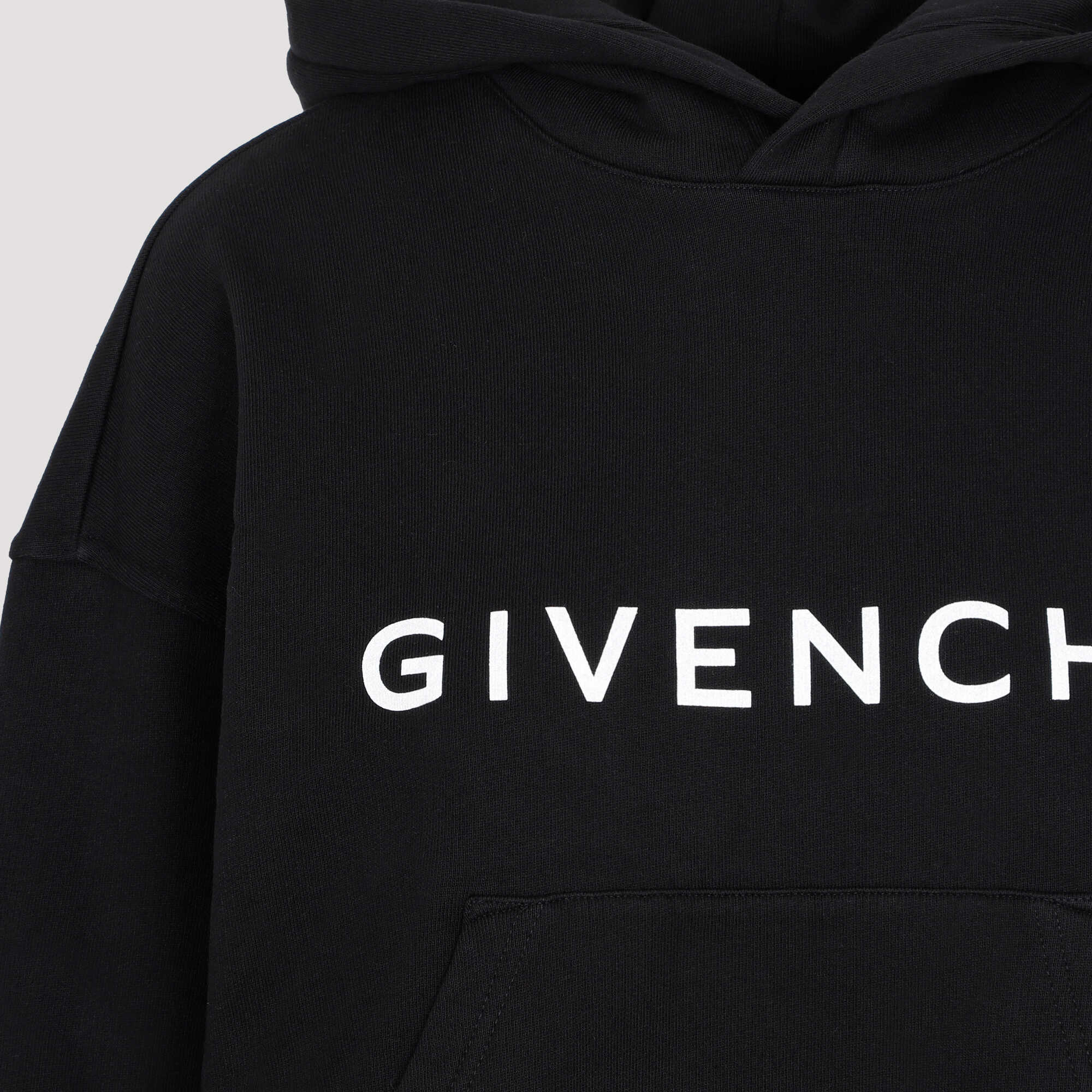 Givenchy Black Cotton Sweatshirt. Crafted in pure black cotton. Attached hood, long sleeves, ribbed cuffs, front kangaroo pocket, contrasting "4G" logo on the back, contrasting "Givenchy" logo on the front, deconstructed straight hem.