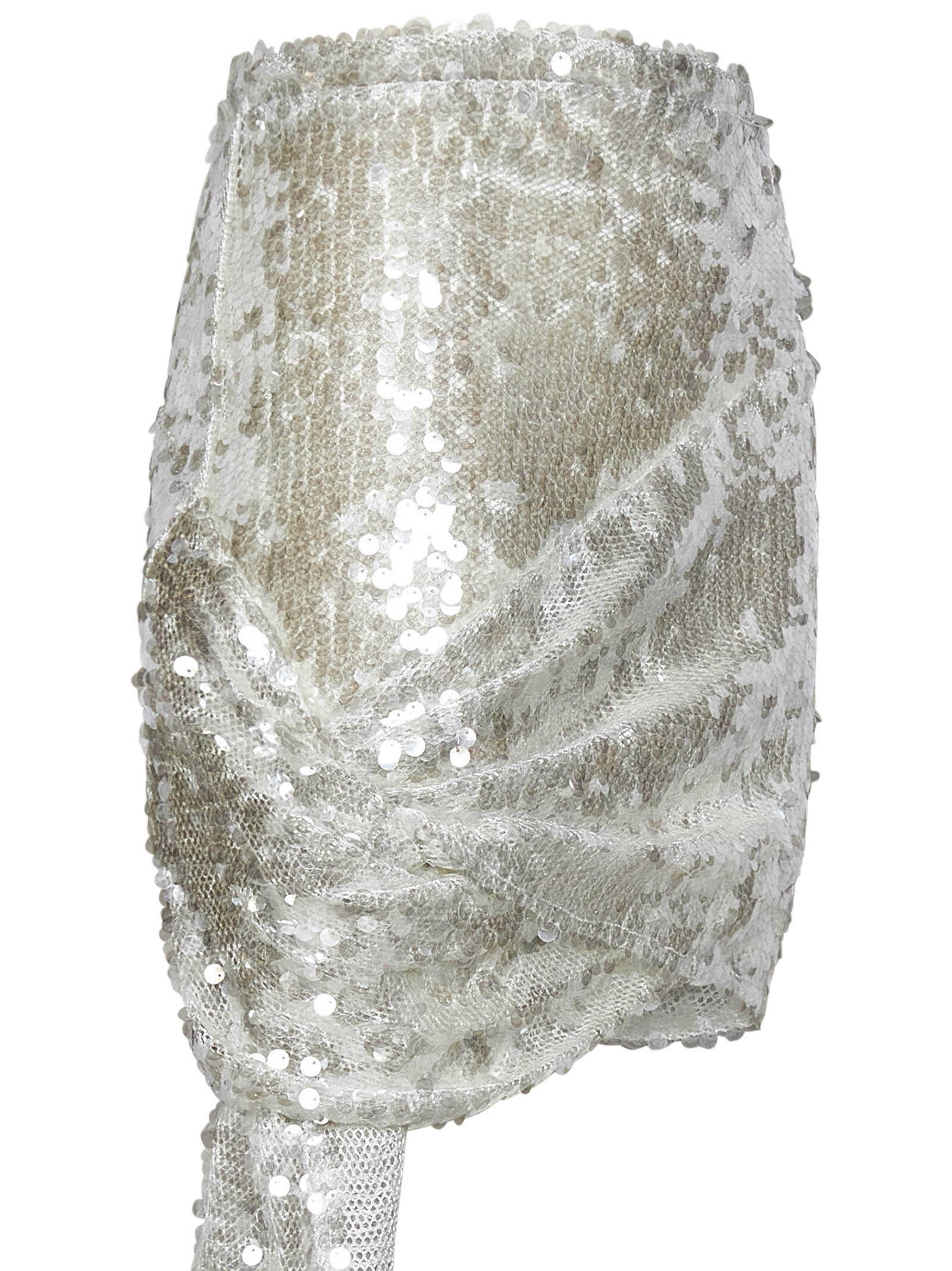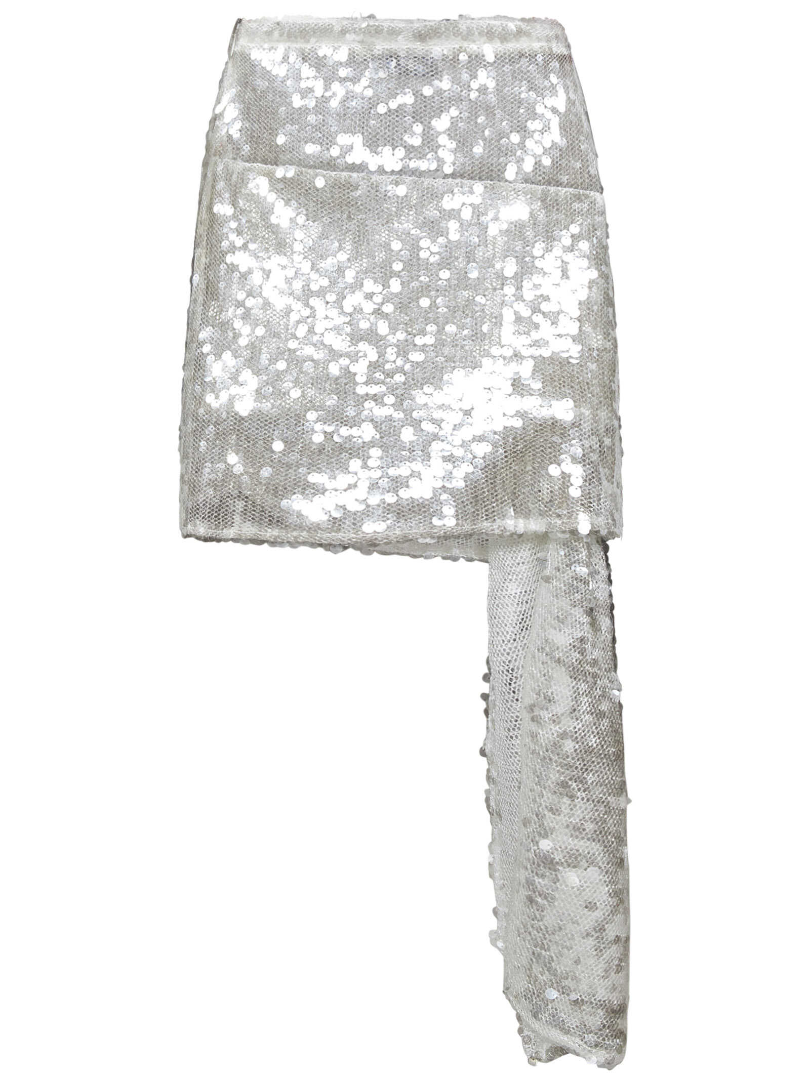 Sheer white sequins asymmetric miniskirt with train detail.