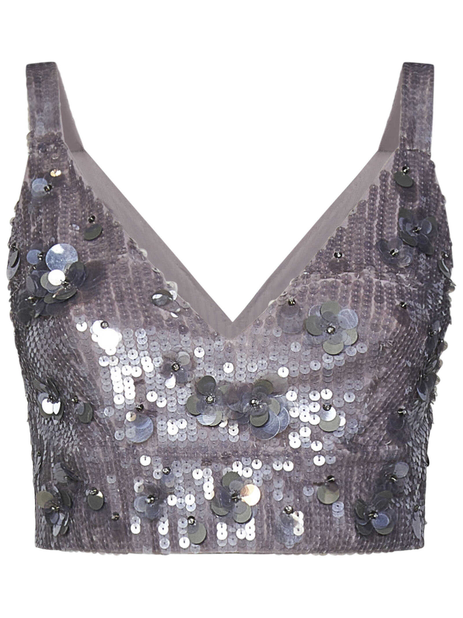 Cropped grey tulle top with sequins and glass beads embroidered all-over.