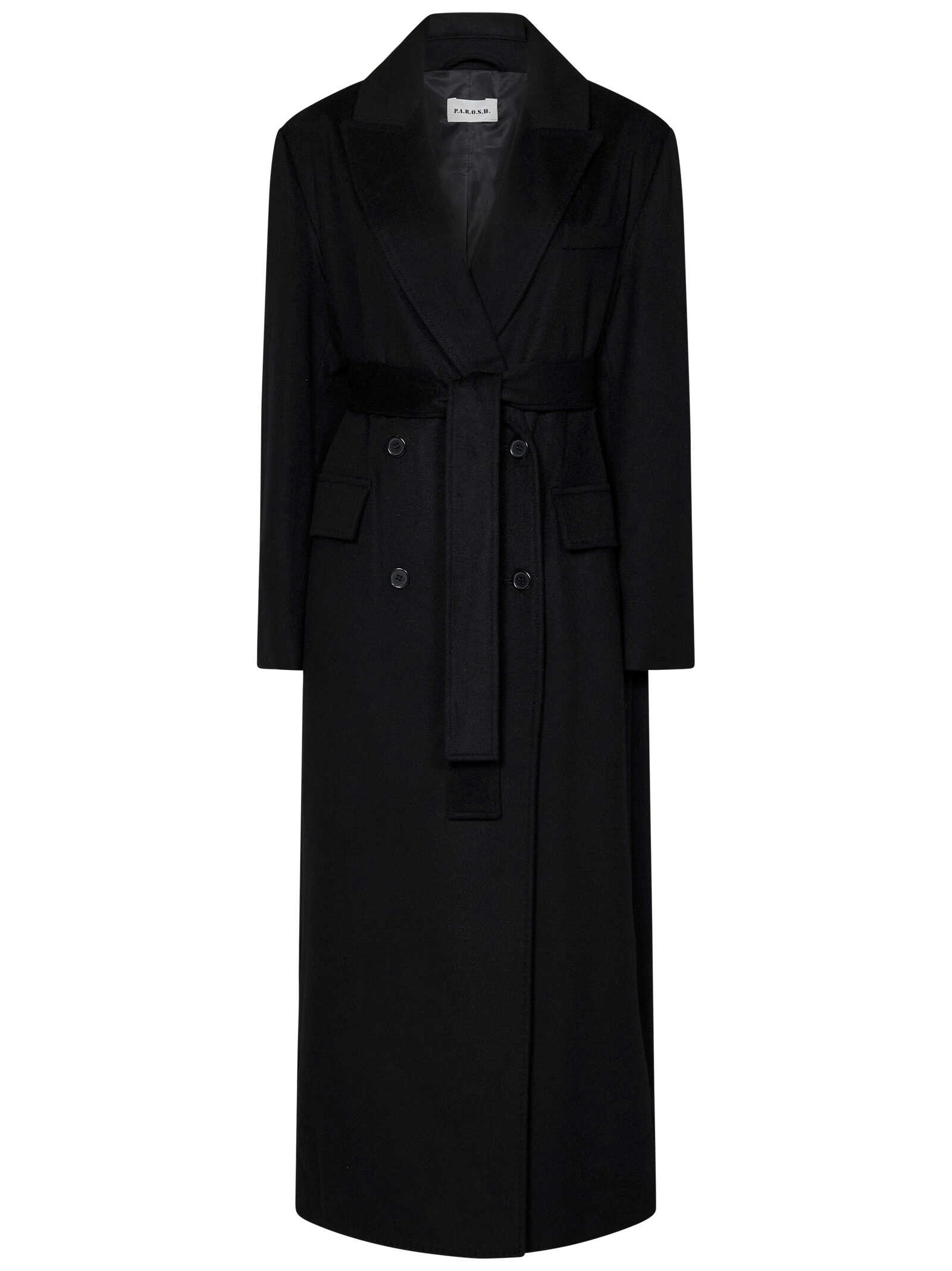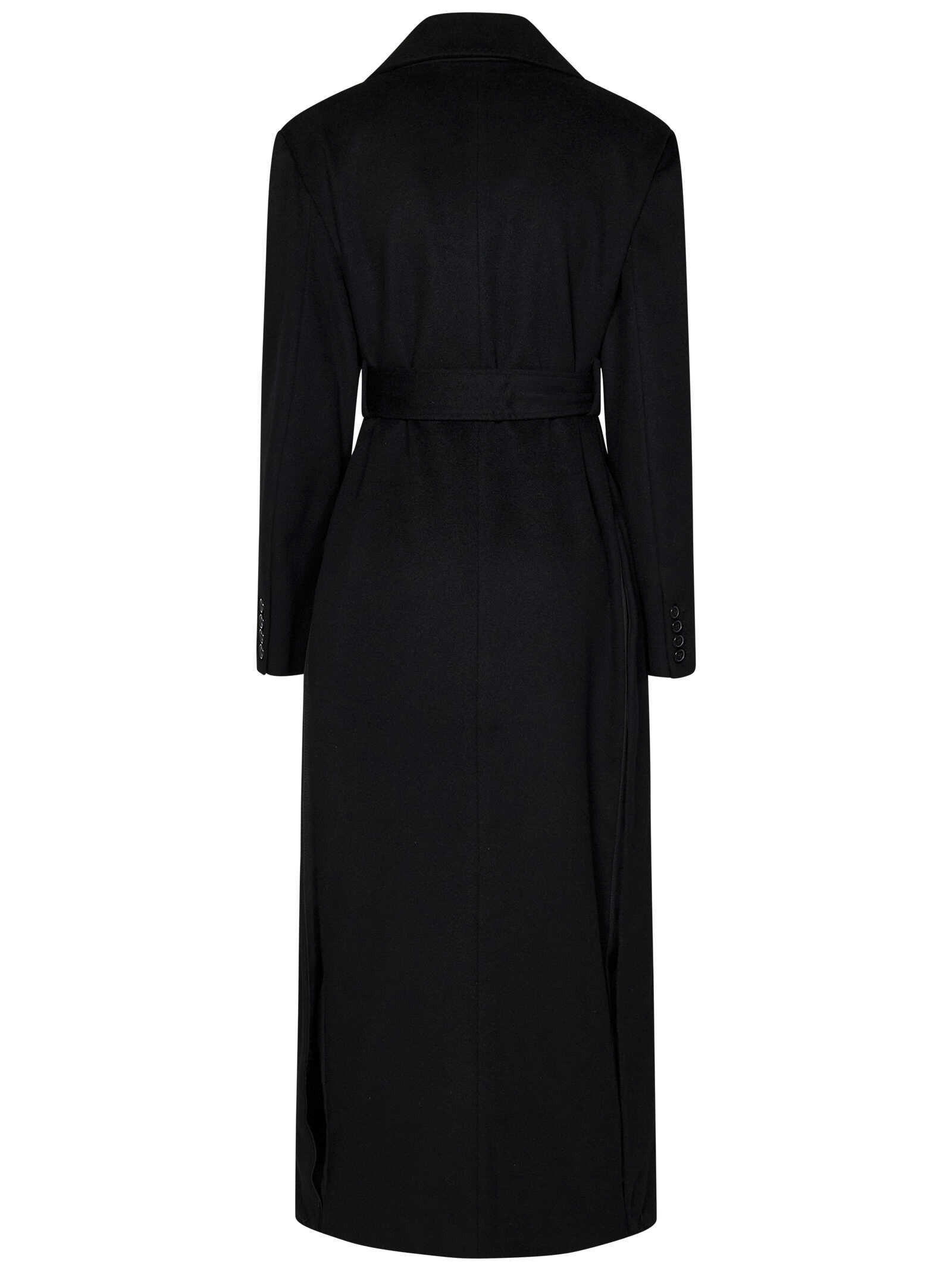 Black wool and cashmere double-breasted coat with belt at the waist and side slits.