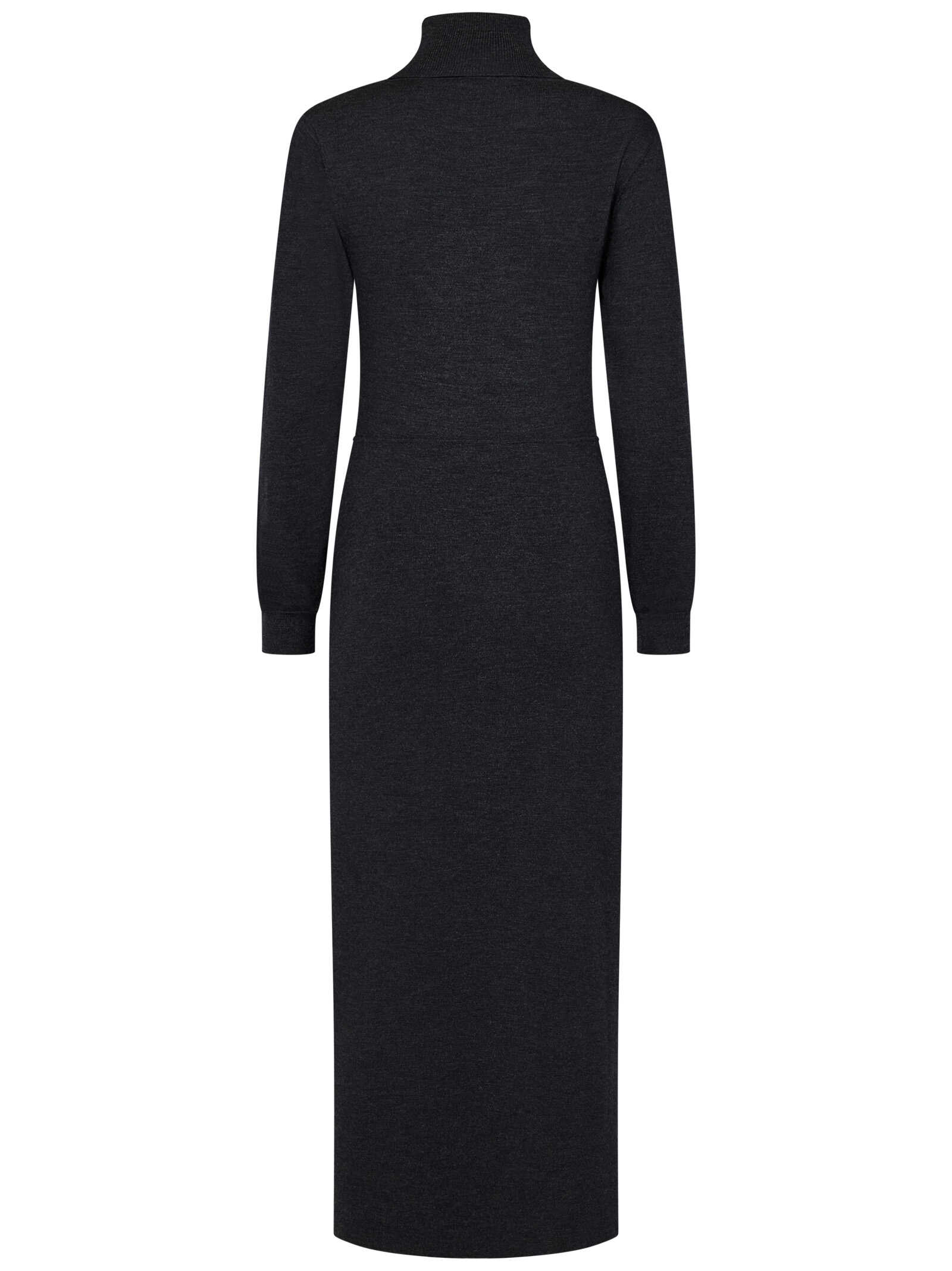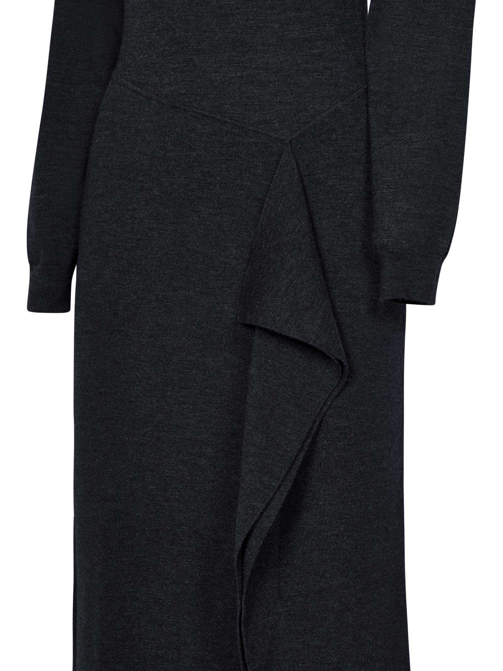 High-collar dark grey stretch wool and cashmere knit midi dress with ruffles detail.