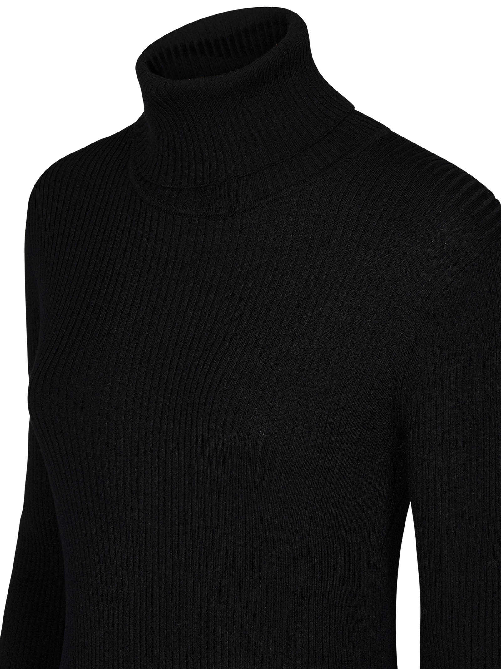 High-collar black ribbed viscose blend knit midi dress with cut-out detail at back.