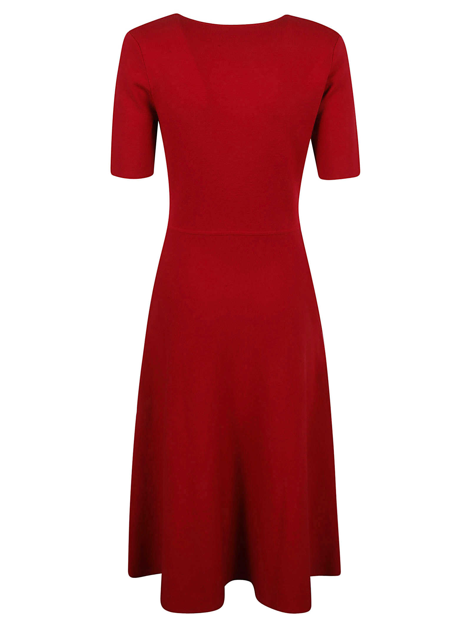 bright red wool blend stretch-design knitted construction crew neck short sleeves fitted waistline flared skirt unlined straight hem mid-length