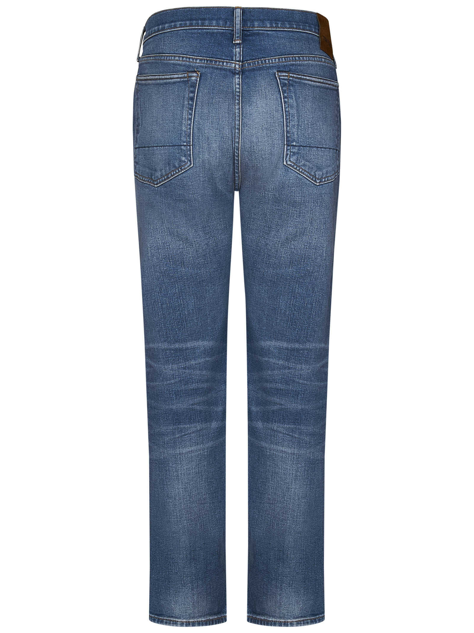 Standard-fit washed blue cotton denim five-pocket jeans.