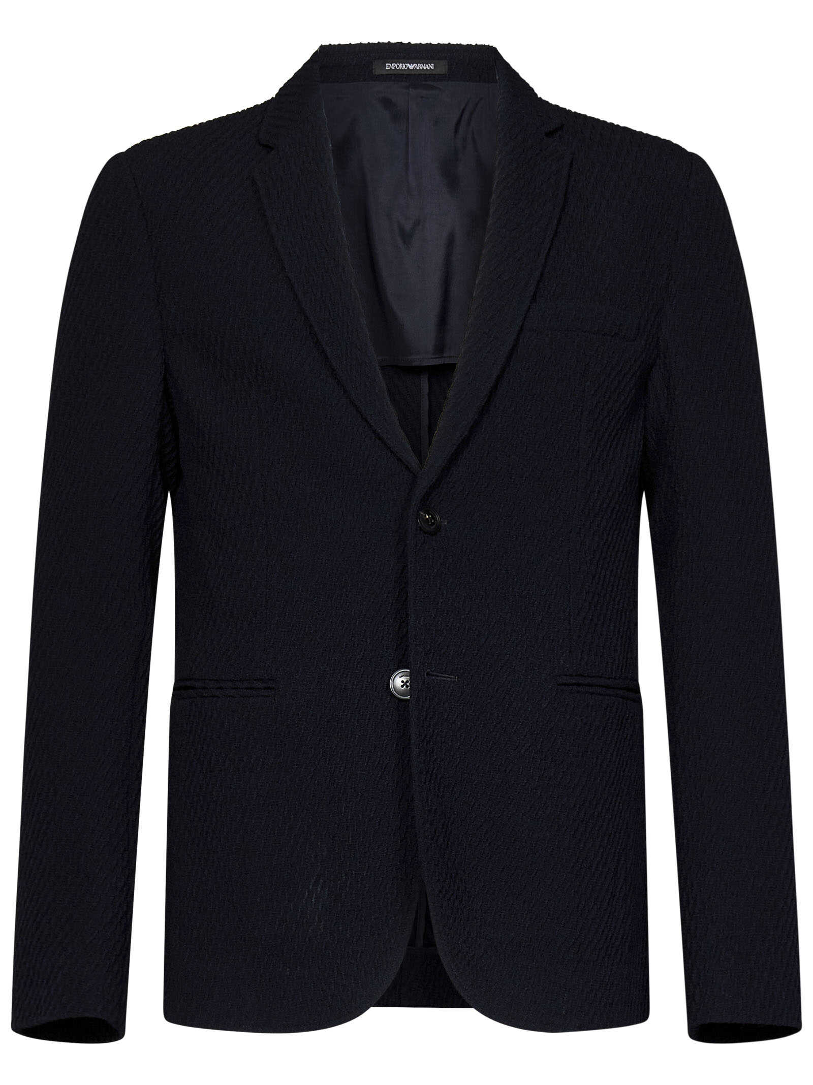 Navy blue 3D-effect virgin wool stretch jersey knit suit with single-breasted blazer.