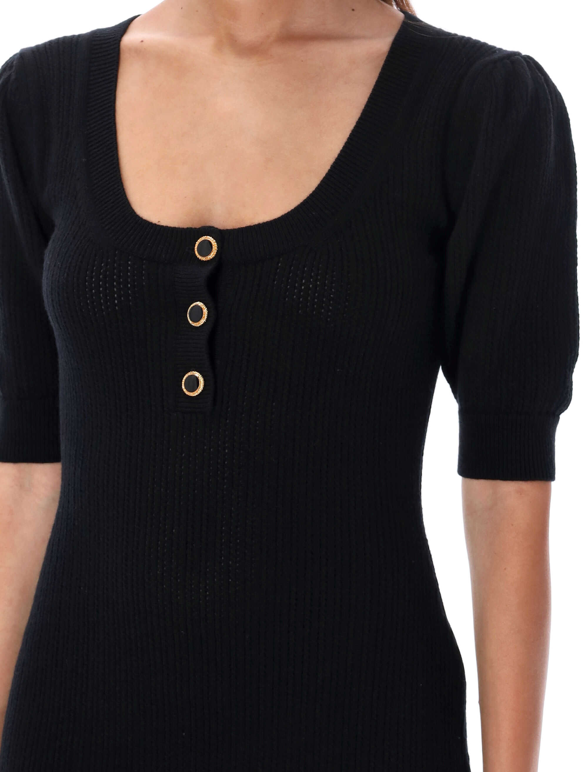 Elevate your style with this stunning black mini dress by ALESSANDRA RICH. Crafted from luxurious 100% wool, this dress features a slim fit, front button detailing, and a feather hem embellishment. Perfect for any special occasion. Model is 1,72m and wears size 40.