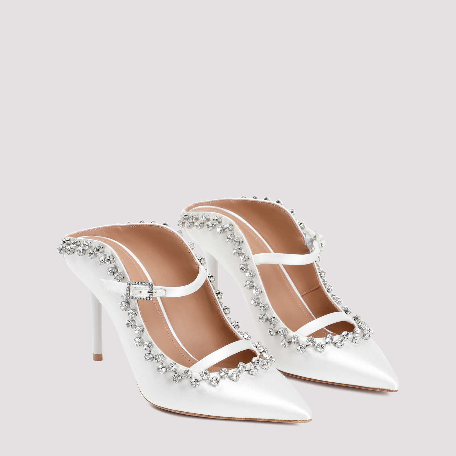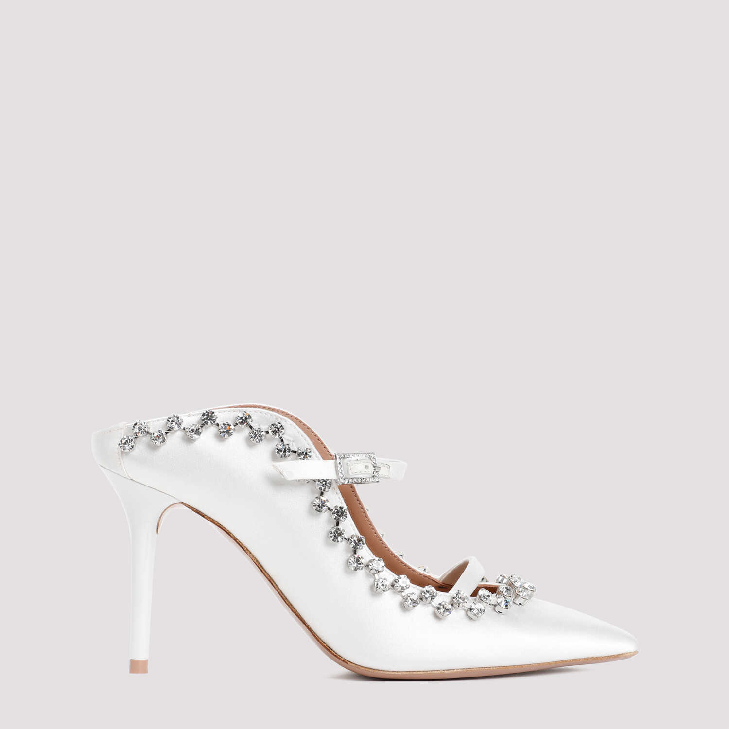 Step into luxury with the Malone Souliers Gala 85 satin pumps. These elegant white pumps feature a pointed toe, adjustable crystal buckle strap, and stiletto heel with crystal trim. Perfect for adding a touch of glamour to any outfit.