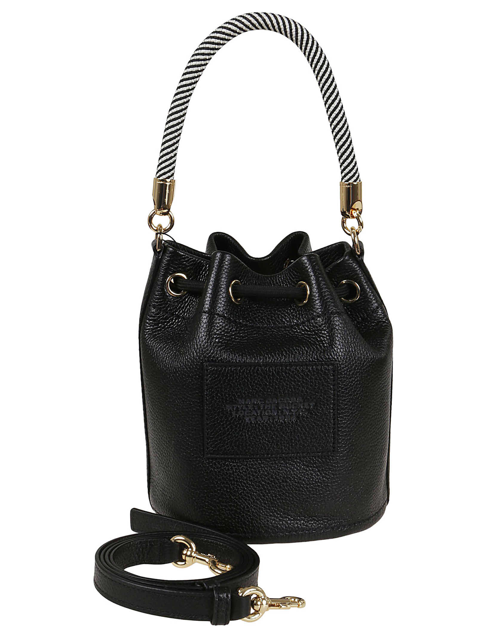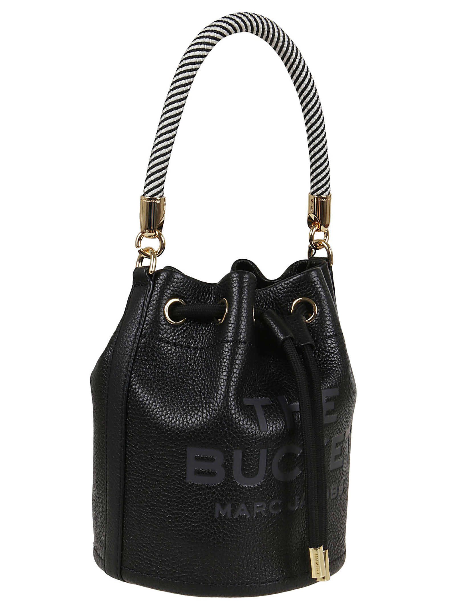Marc Jacobs The Bucket Bag in black leather. Black leather, textured rope handle, drawstring fastening, golden-tone metallic hardware. Tonal detachable crossbody strap, 1 interior slip pocket, logo lettering on front, fully lined.