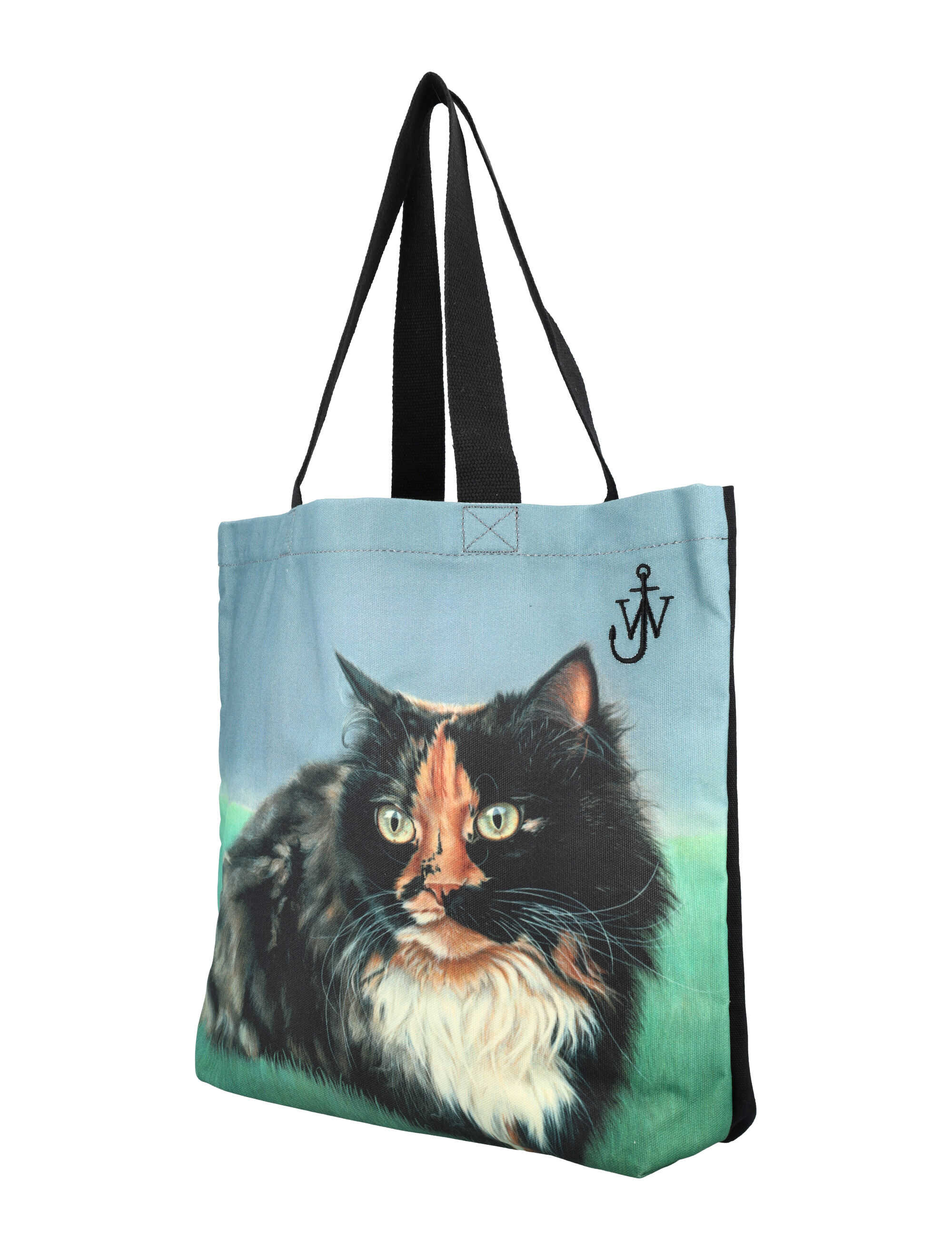 Stand out from the crowd with this vibrant EMERALD Cat tote bag by JW Anderson. Made from 100% cotton, this spacious handbag features a unique cat print design, sturdy black handles, and the iconic JW Anderson logo. Perfect for adding a pop of color to any outfit. Dimensions: Height 41cm, Width 48cm, Depth 12.5cm.