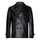 Double-breasted black leather coat with lapel collar and straps at the cuffs.