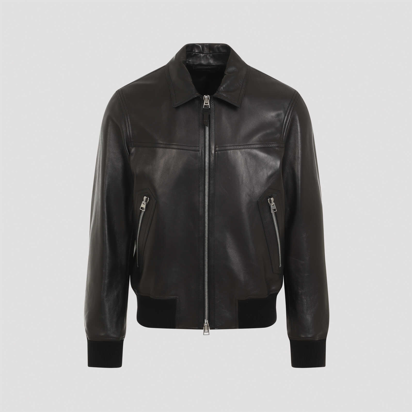 Elevate your style with the TOM FORD Black Lamb Leather Bomber Jacket. Made with 100% lamb leather, this jacket exudes luxury and sophistication. With a sleek design featuring a pointed collar, front zip closure, and ribbed cuffs and hem, this jacket is a must-have for the modern man. Stay stylish and comfortable all day long in this timeless piece.