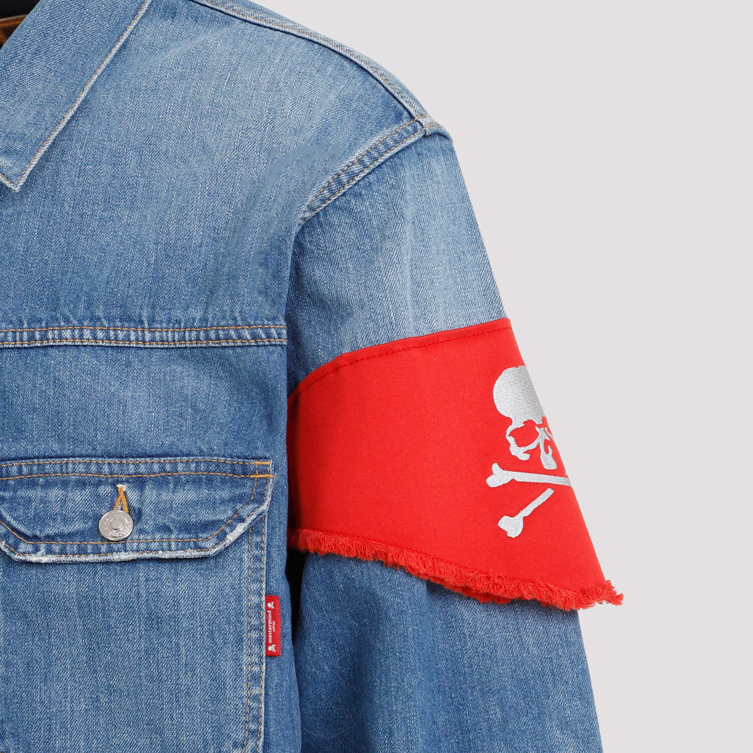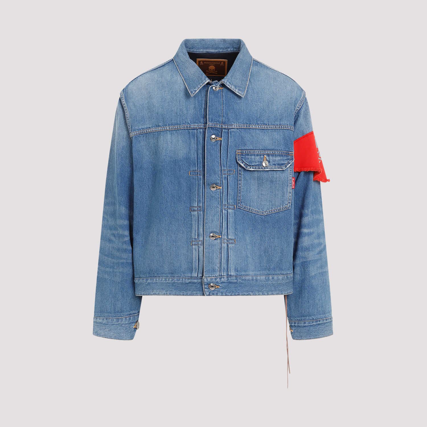Elevate your style with the iconic MASTERMIND Japan denim jacket. Crafted from 100% cotton, this indigo piece features a pointed collar, front button closure, and a unique red bandana detail on the sleeve. Stand out with the golden-toned embroidered logo on the back and button tabs at the hem. Perfect for the fashion-forward man.