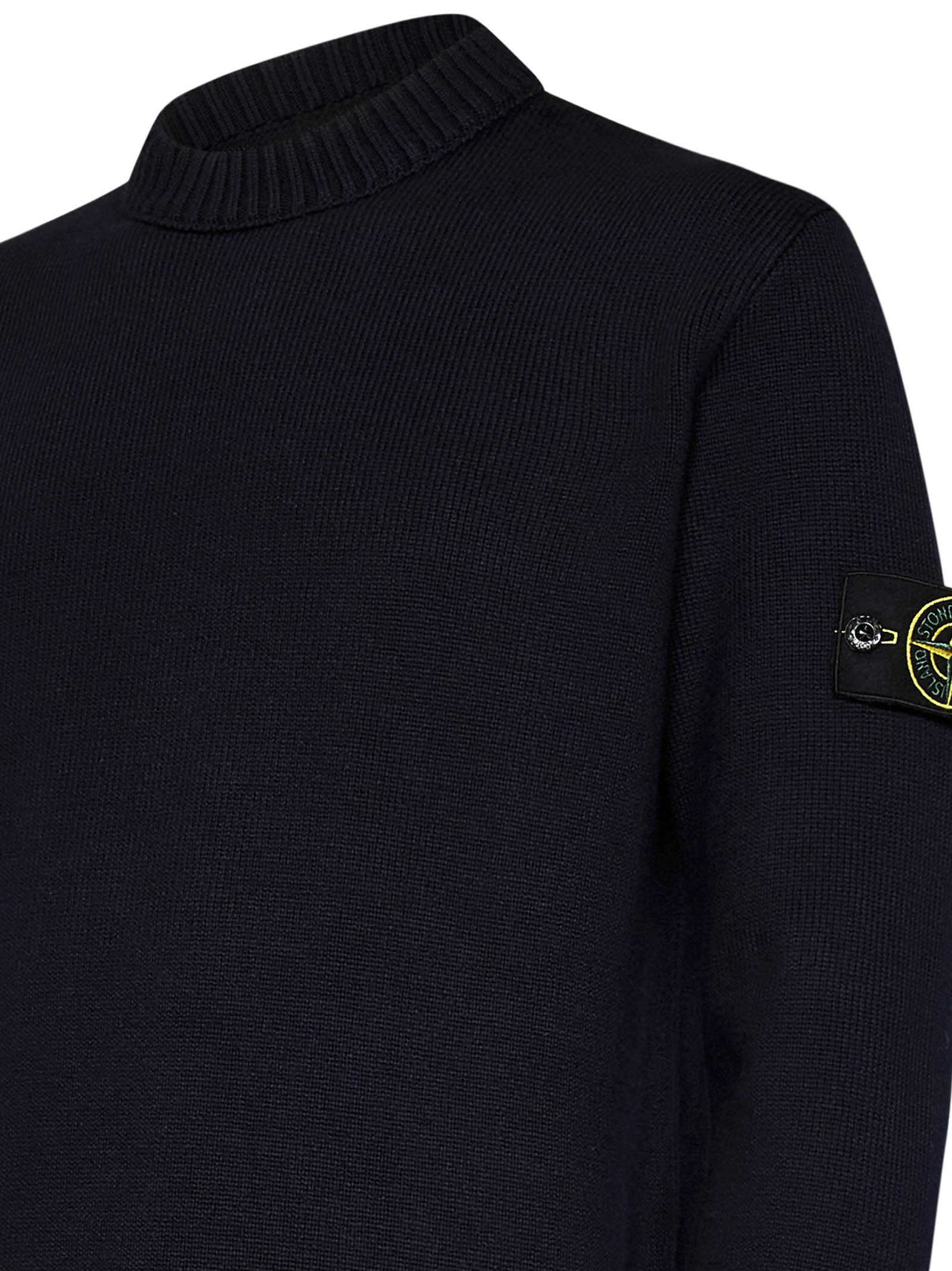 Blue stockinette stitch winter cotton knit crewneck sweater with logo badge at sleeve.