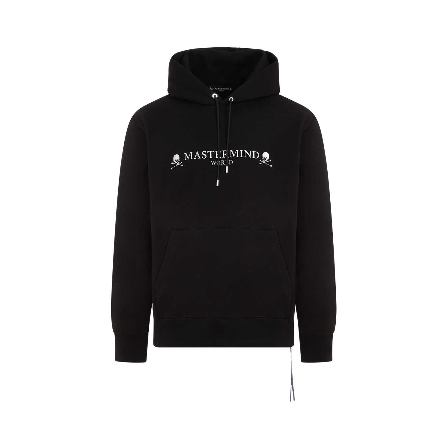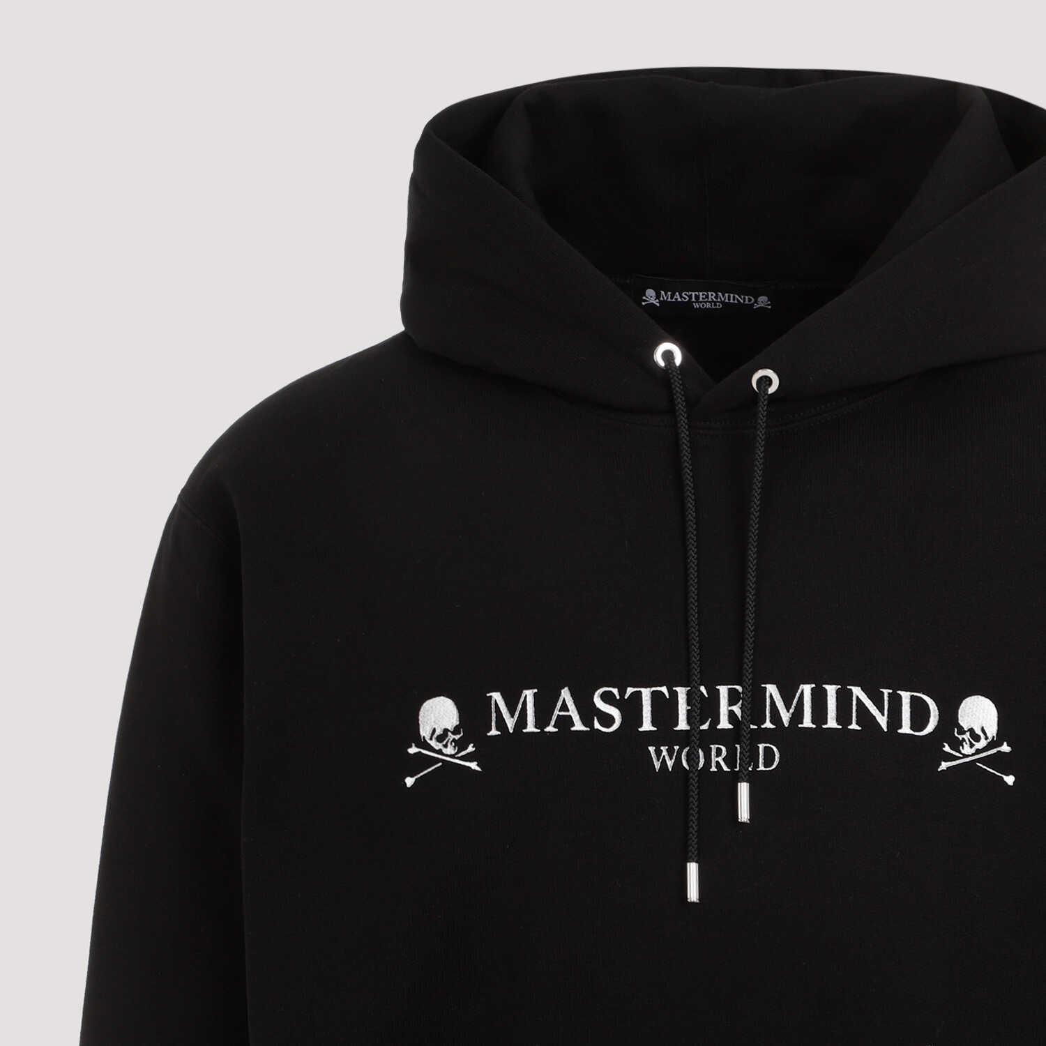 Elevate your street style with this sleek black cotton hoodie from MASTERMIND. Featuring a hood with drawstring, kangaroo pocket, and white logos on the front and back, this hoodie is the perfect blend of comfort and style. Complete with ribbed cuffs and hem, and a unique side strap detail, this hoodie is a must-have for any fashion-forward individual. Get yours now and make a statement wherever you go!