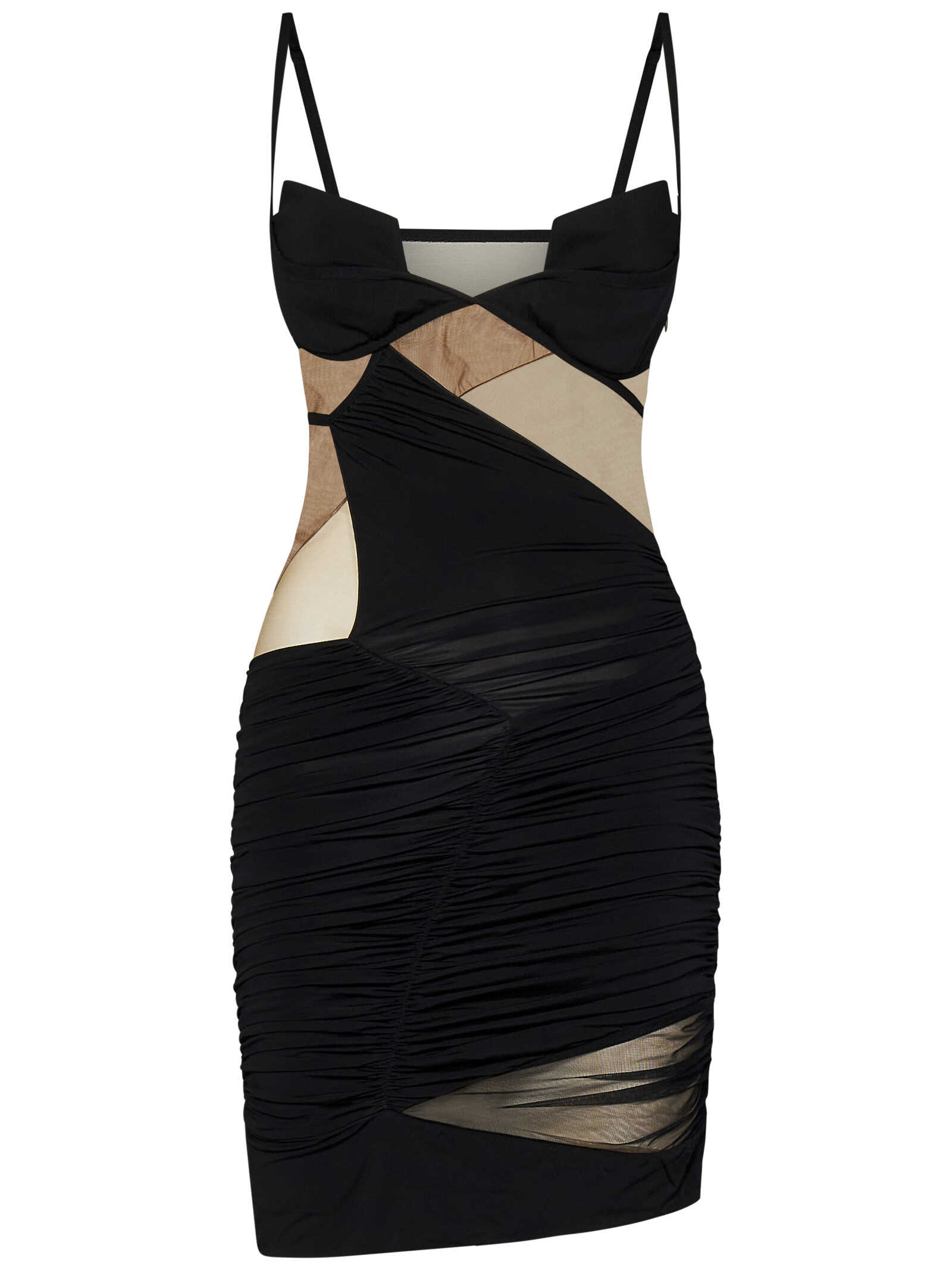 Short dress in black stretch viscose jersey with hazelnut tulle inserts with padded cups.