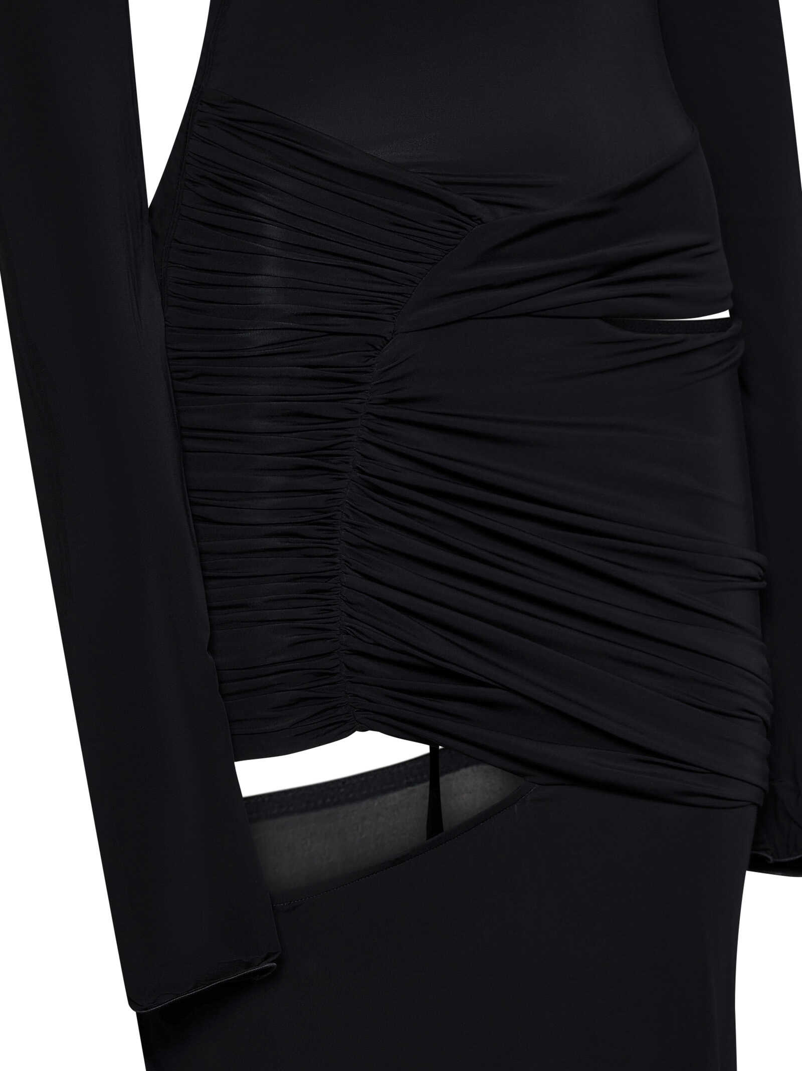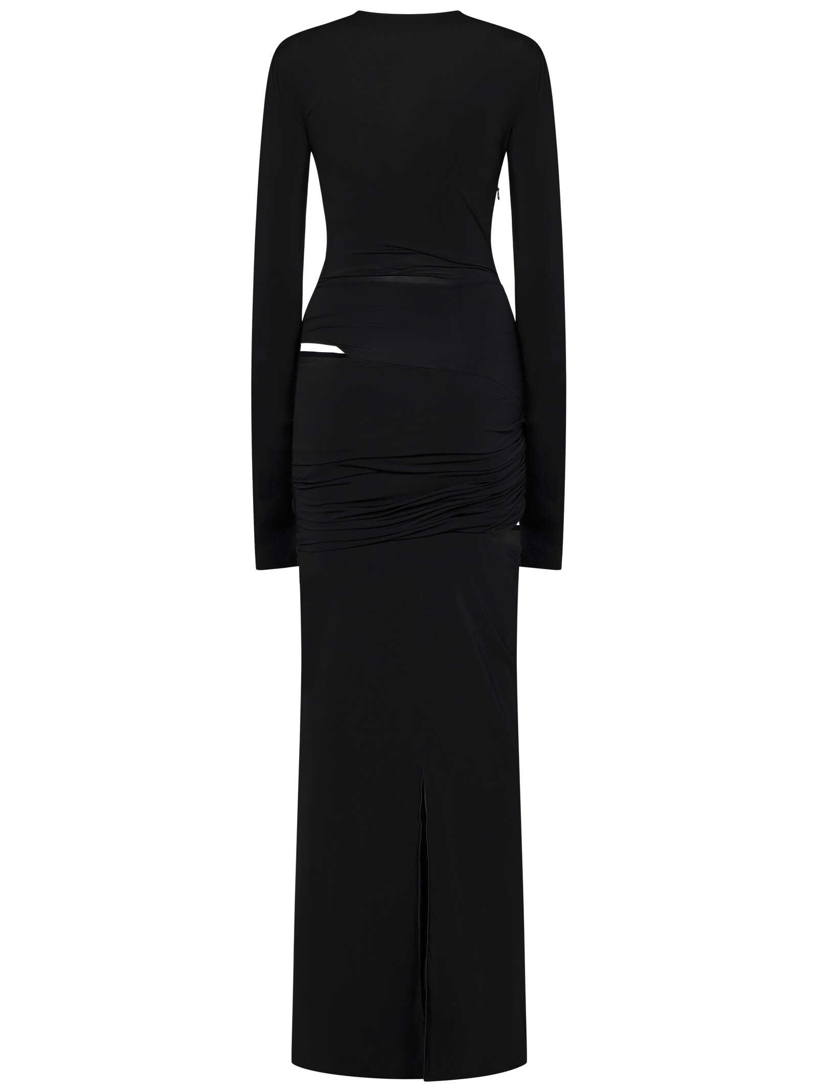 Long dress in black stretch jersey with cut-outs at the waist and draped detail.