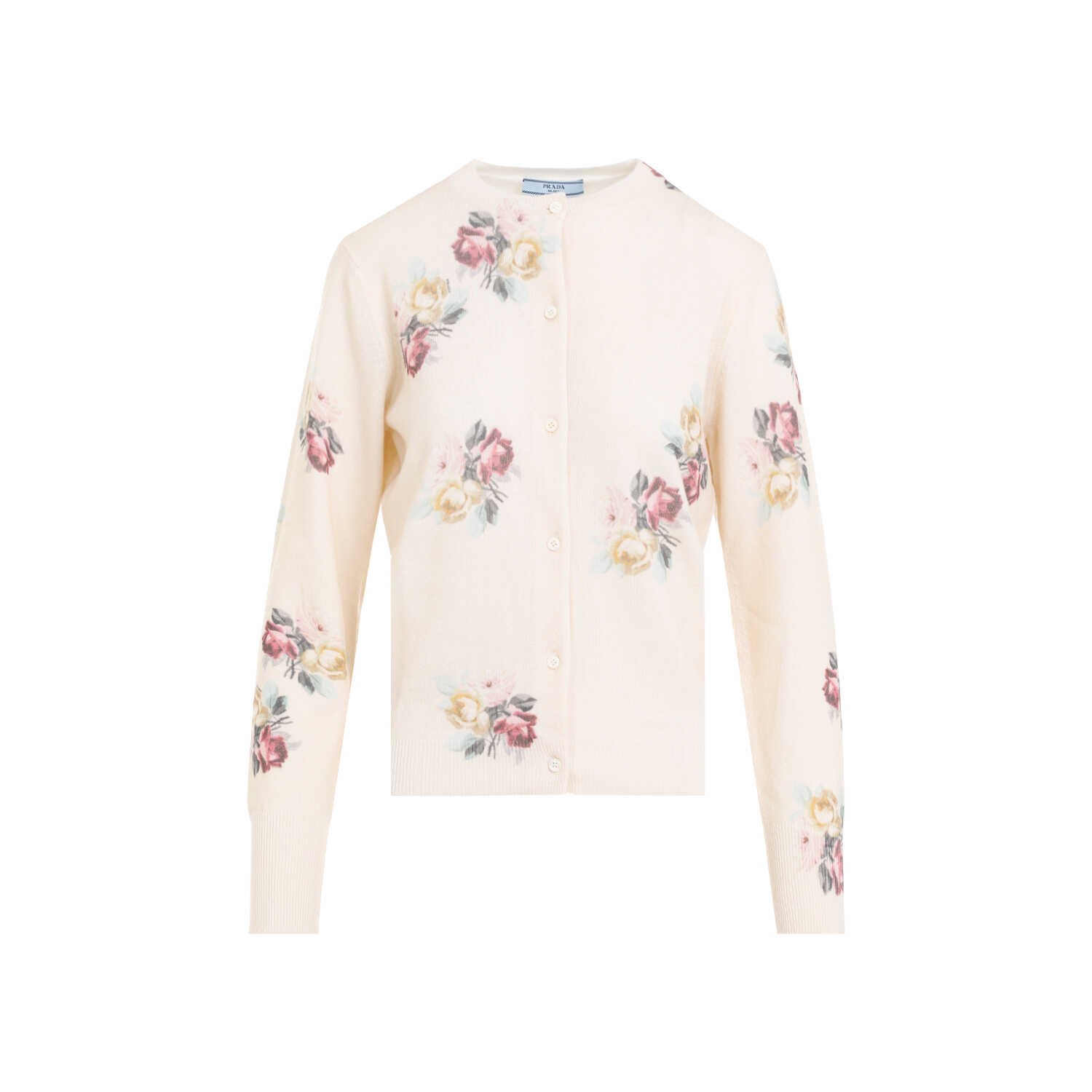Elevate your wardrobe with this elegant Prada cardigan in a soft nude & neutrals color. Made from luxurious wool, it features a delicate floral pattern, crew neck, front button closure, and ribbed edges. The long sleeves and straight hem add a classic touch. Perfect for layering over any outfit, this timeless piece is a must-have for every fashion-forward woman. Shop now and experience the luxury of Prada!