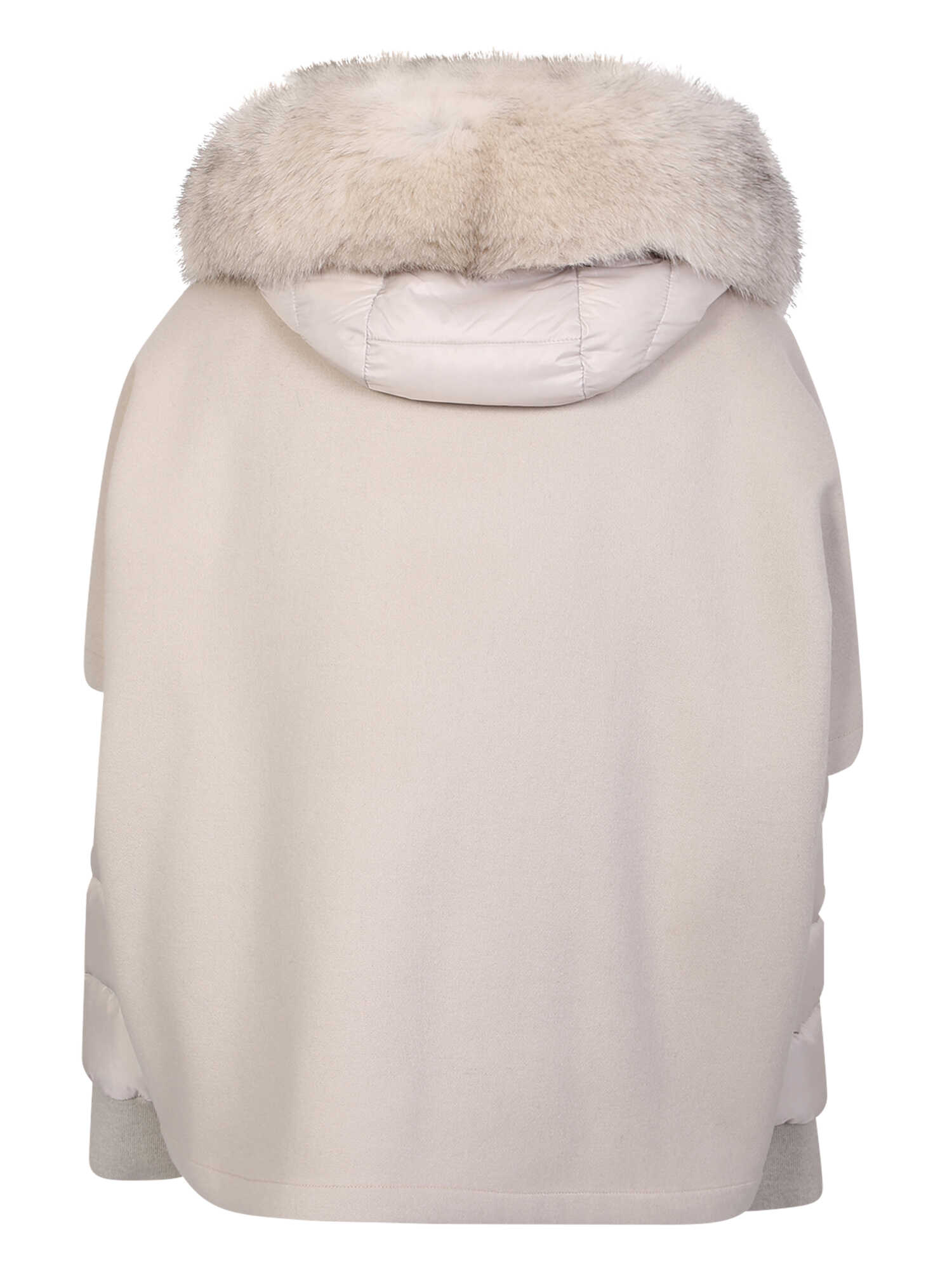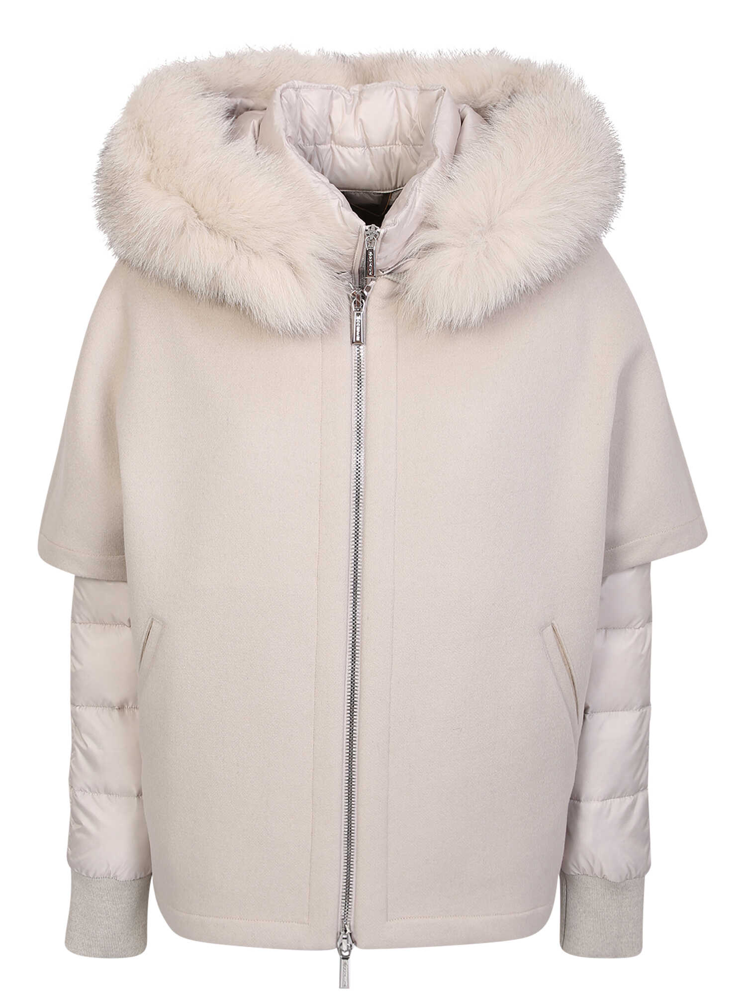 Stay warm and stylish in this versatile Moorer Grey Down Jacket. Featuring a high collar, classic hood, and quilted design. Made with a luxurious blend of cashmere, wool, and silk. Detachable fur adds a touch of elegance. Perfect for chilly days. Elevate your winter wardrobe with this Italian-made masterpiece.