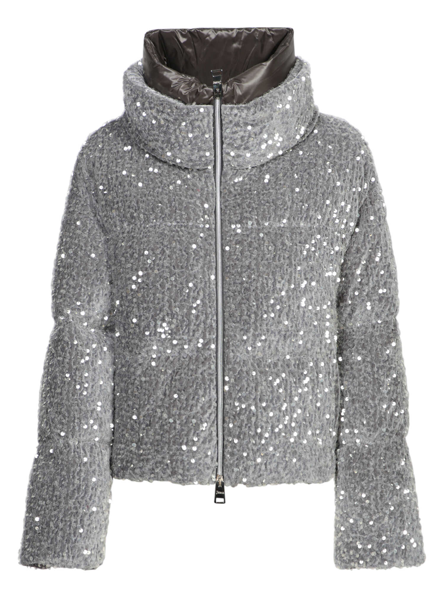 Elevate your winter wardrobe with the HERNO Grey Down Jacket. Crafted from 100% polyester, its contemporary design and reflective sequins add elegance, while the high neck and front zip offer warmth and style for any occasion.