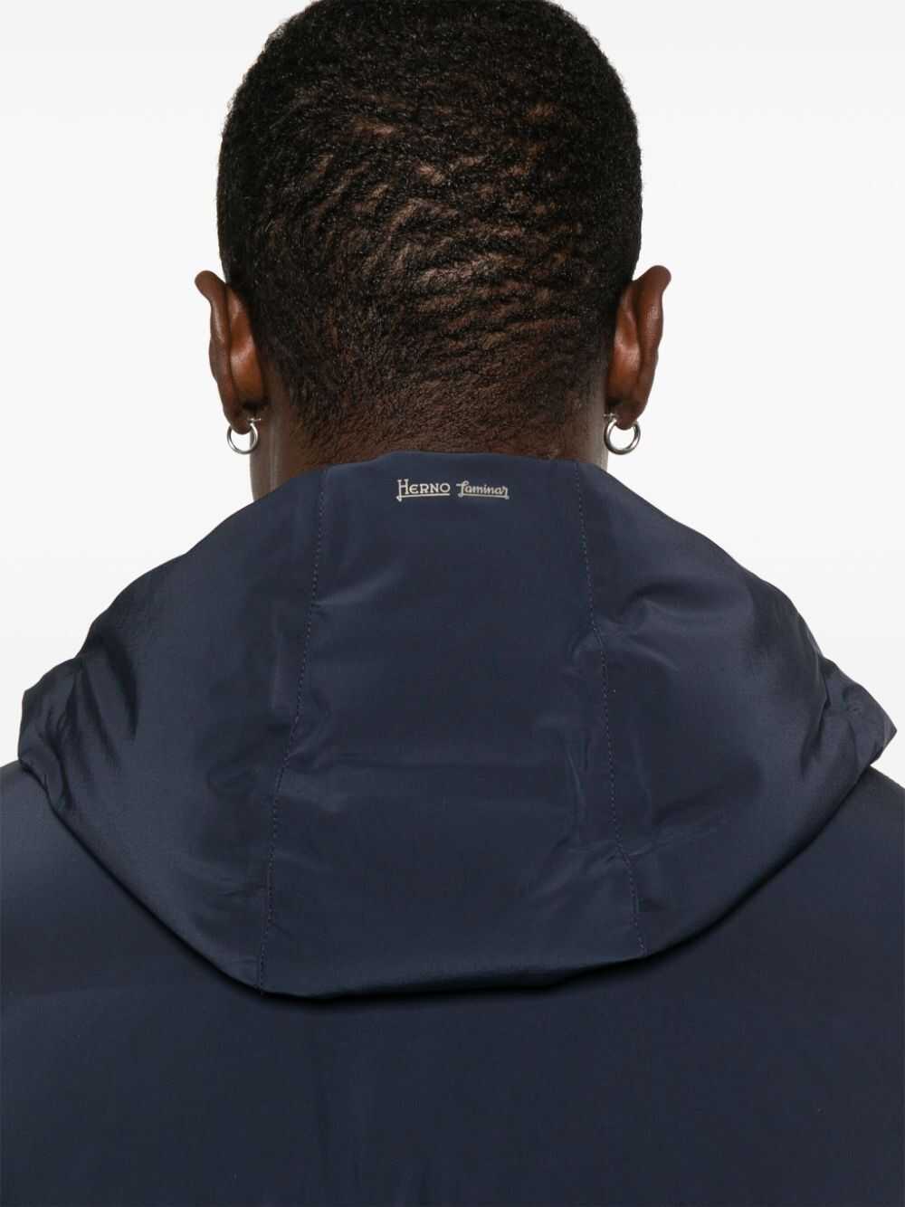Blue LAMINAR bomber jacket in 4way stretch matte fabric with hood.