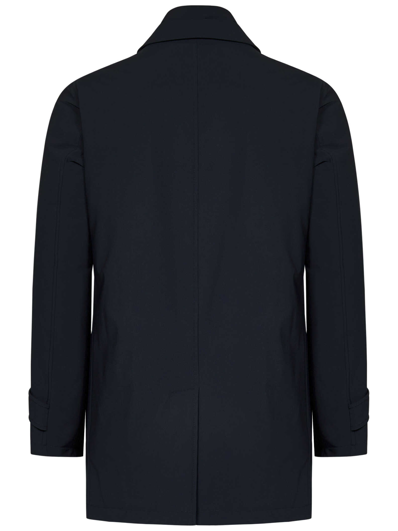 Midnight blue padded nylon down jacket with high collar and shirt lapels.