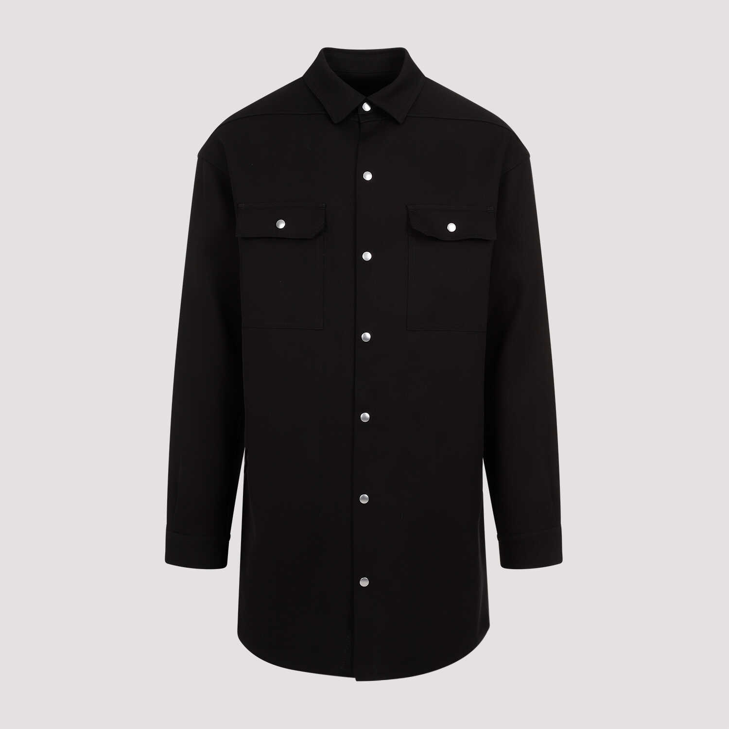 Elevate your style with the RICK OWENS RU01D3728.SW jacket. This black silk and virgin wool blend shirt features a classic collar, flap pockets, and a signature strap embellishment. Perfect for adding a touch of edgy sophistication to your wardrobe. Don't miss out on this timeless piece!