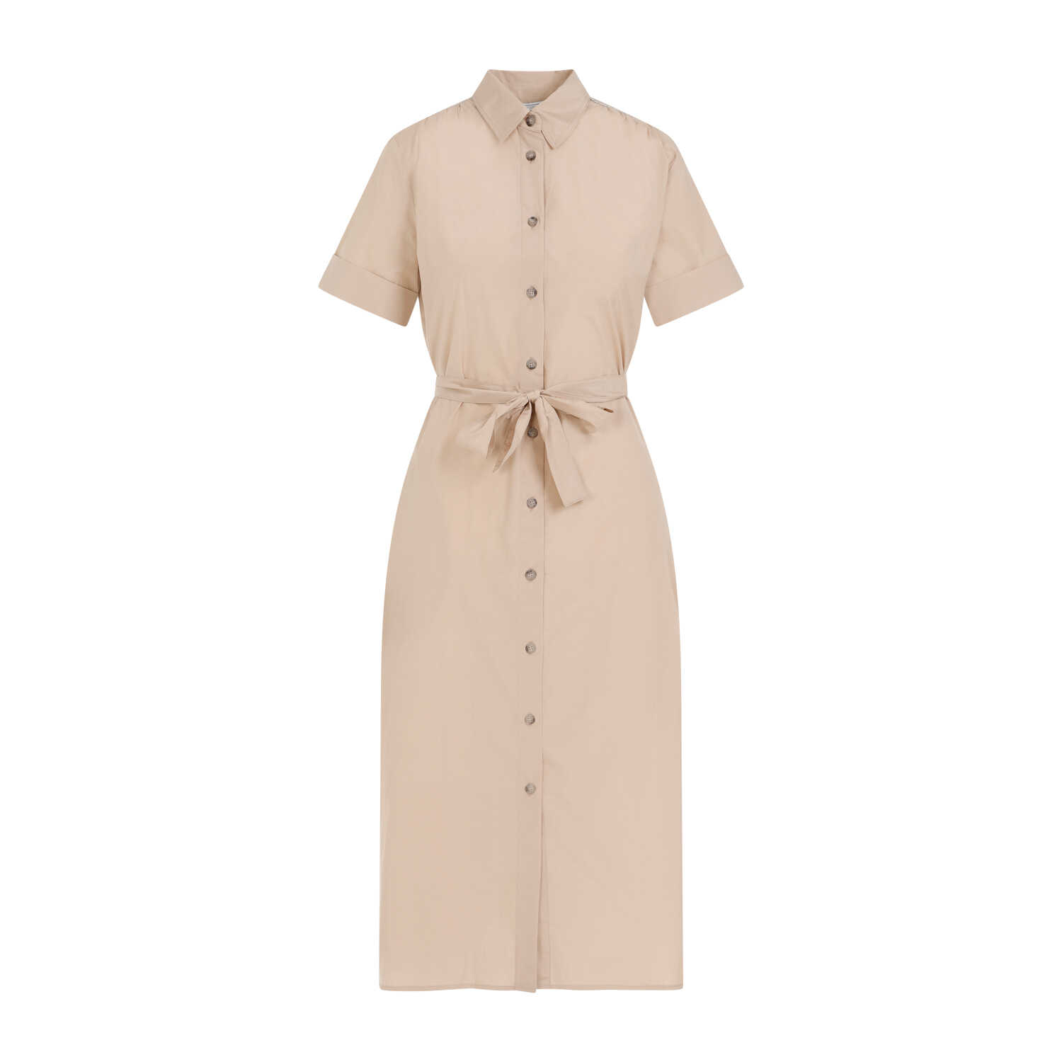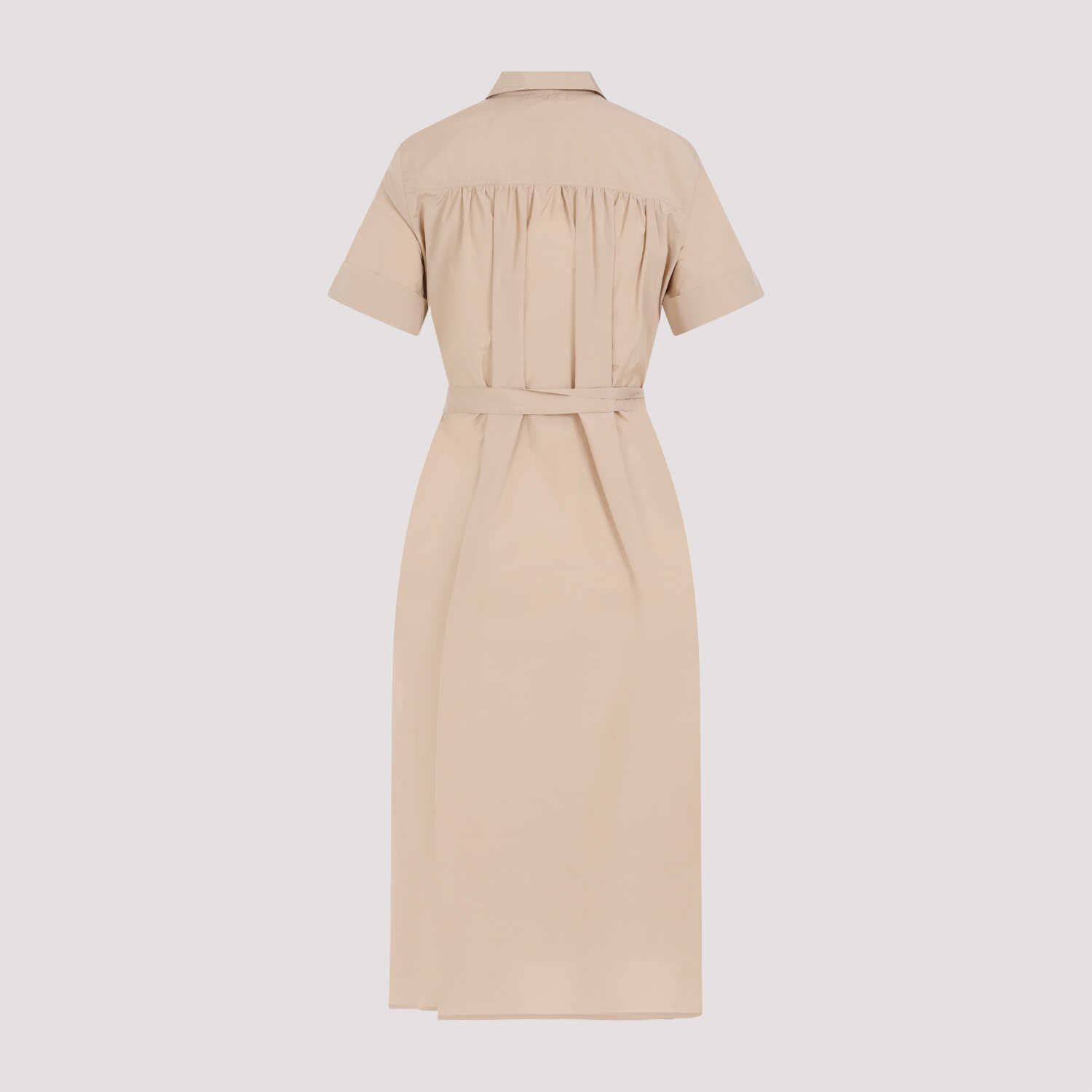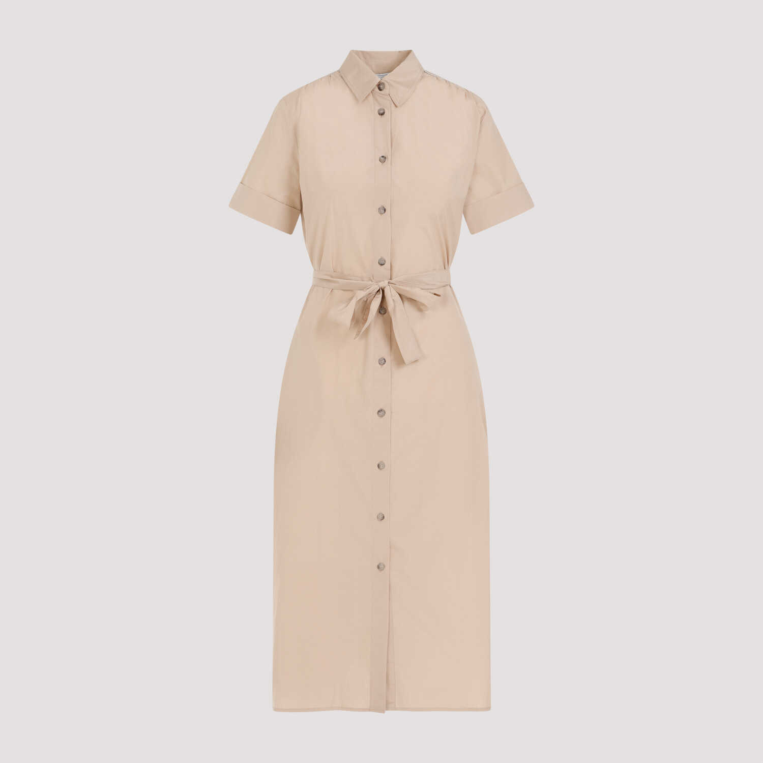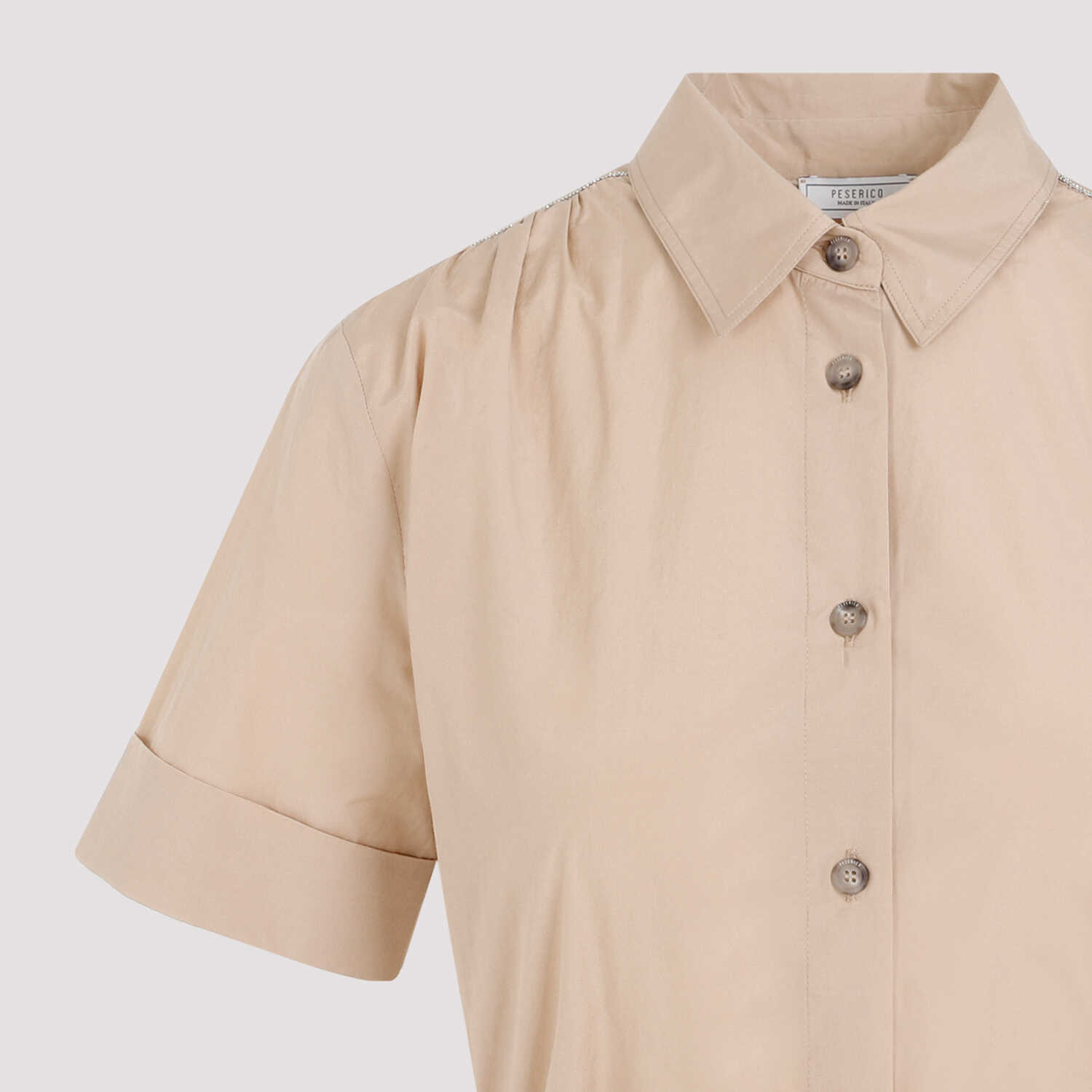 Peserico Chemisier Beige Cotton Midi Dress. Crafted from beige cotton, chemisier design, pointed collar, short sleeves, front button closure, tonal belt on the waist, back double reverse pleats, straight hem.